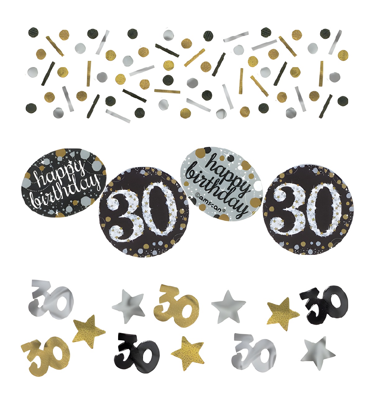 Ensemble de confettis pour décorer la table thématique de votre anniversaire ou événement. Ce pack comprend 3 petits sachets avec différents types de confettis, dont un avec des formes variées en noir, or et argent, et un autre sac avec le numéro en question dans les mêmes couleurs.