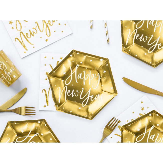 Cet ensemble de 6 assiettes dorées se distingue par sa forme hexagonale, les étoiles blanches qui les ornent et l'inscription « Bonne Année » au centre de chaque unité.