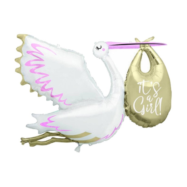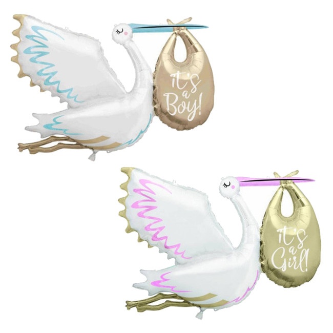 Ce ballon est idéal pour célébrer la naissance de votre bébé. Il représente la silhouette d'une cigogne avec des détails et un sac avec les mots C'est un garçon en bleu et C'est une fille en rose.