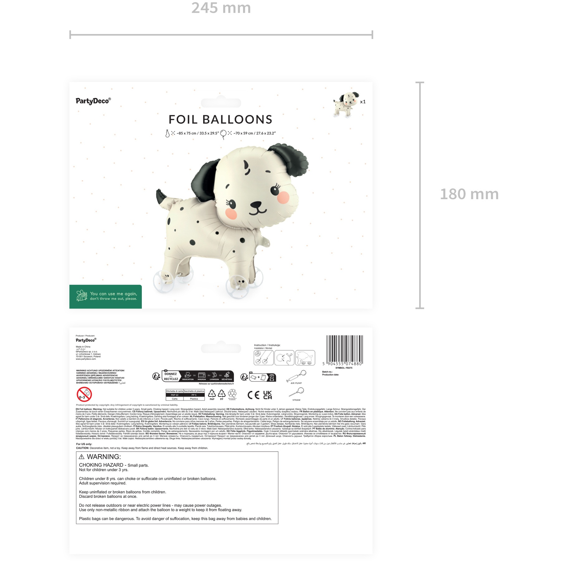 Ballon en mylar en forme de chien, équipé de roues, finition beige et noir. Une fois gonflé, il mesure environ 70 x 59 cm et constitue un élément décoratif grand format à fort impact visuel. Déplié avant gonflage, il mesure environ 85 x 75 cm. Il se gonfle uniquement à l'air, ce qui simplifie votre montage et sa mise en place. Les roues permettent au ballon de se déplacer en douceur sur les surfaces lisses, apportant mouvement et amusement. Son design tendre et moderne est parfait pour vos décorations d'anniversaire et les ambiances enfantines.