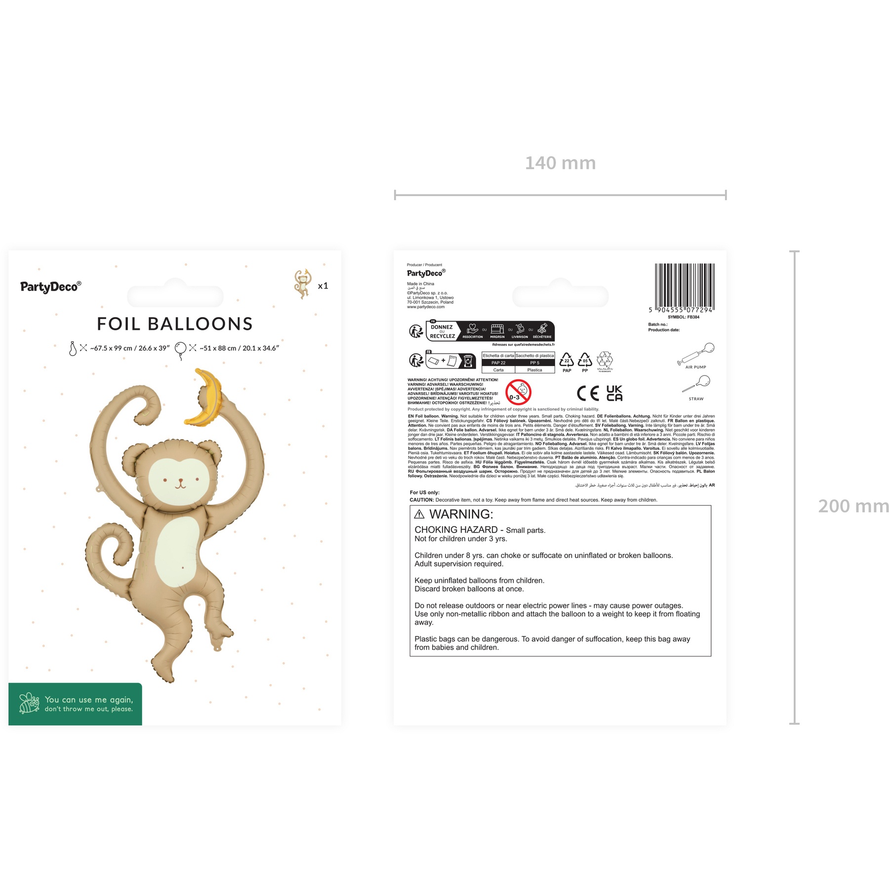 Ballon foil au design de singe dans des tons beige et crème, idéal comme pièce centrale pour vos décorations enfantines sur le thème de la jungle. Son expression douce et sa silhouette originale apportent une touche charmante et chaleureuse aux anniversaires et aux séances photo. Dimensions avant gonflage env. 67,5 x 99 cm ; après gonflage env. 51 x 88 cm. Conçu pour être gonflé uniquement à l'air, il est livré avec une paille pour faciliter le gonflage. Léger et très visible, il se marie facilement avec des guirlandes, d'autres ballons et éléments de décoration thématique.