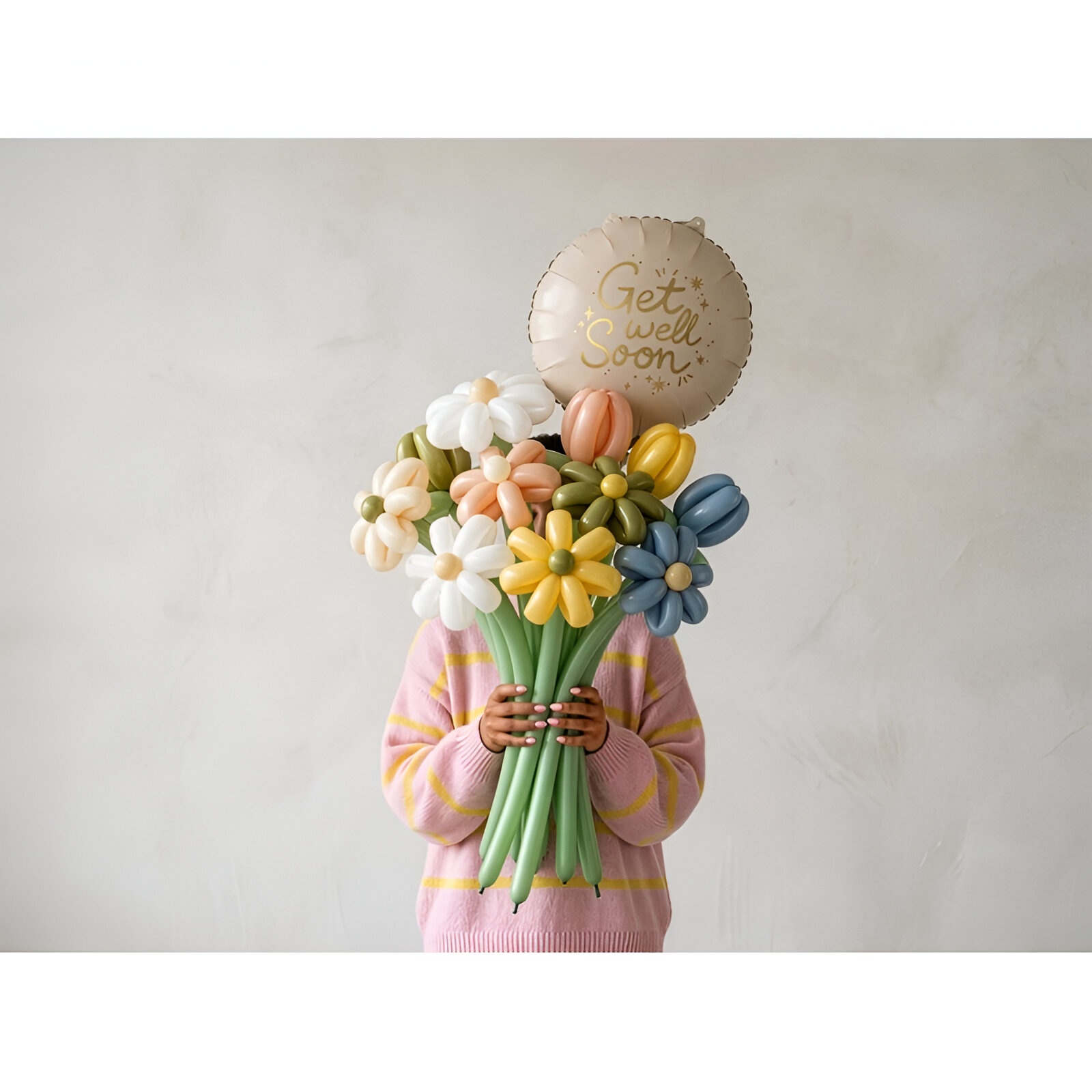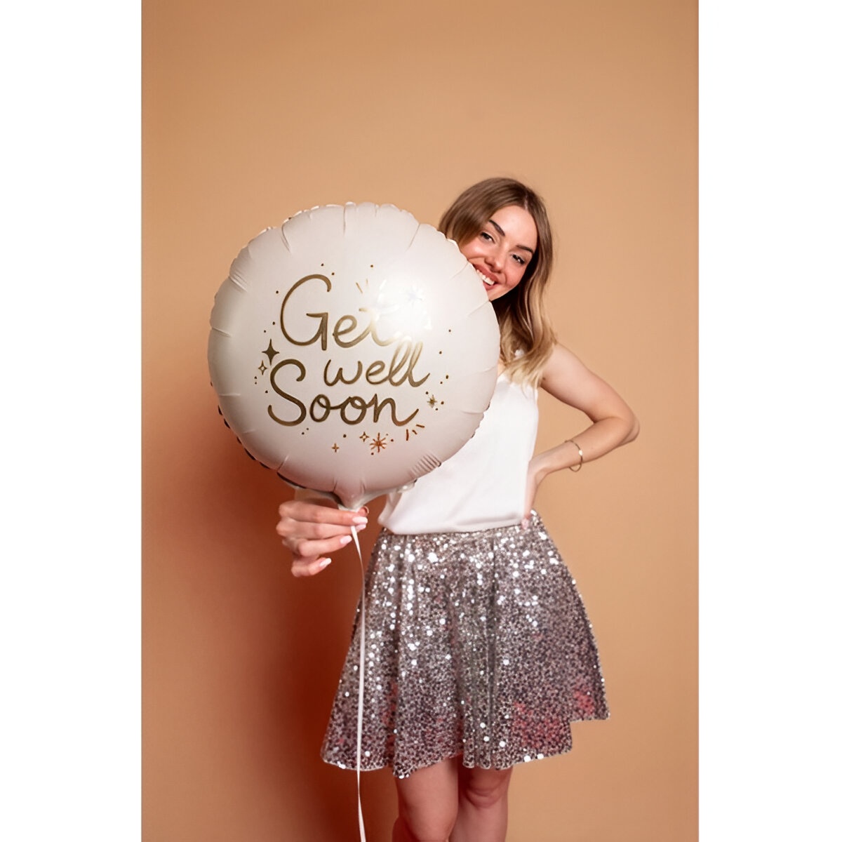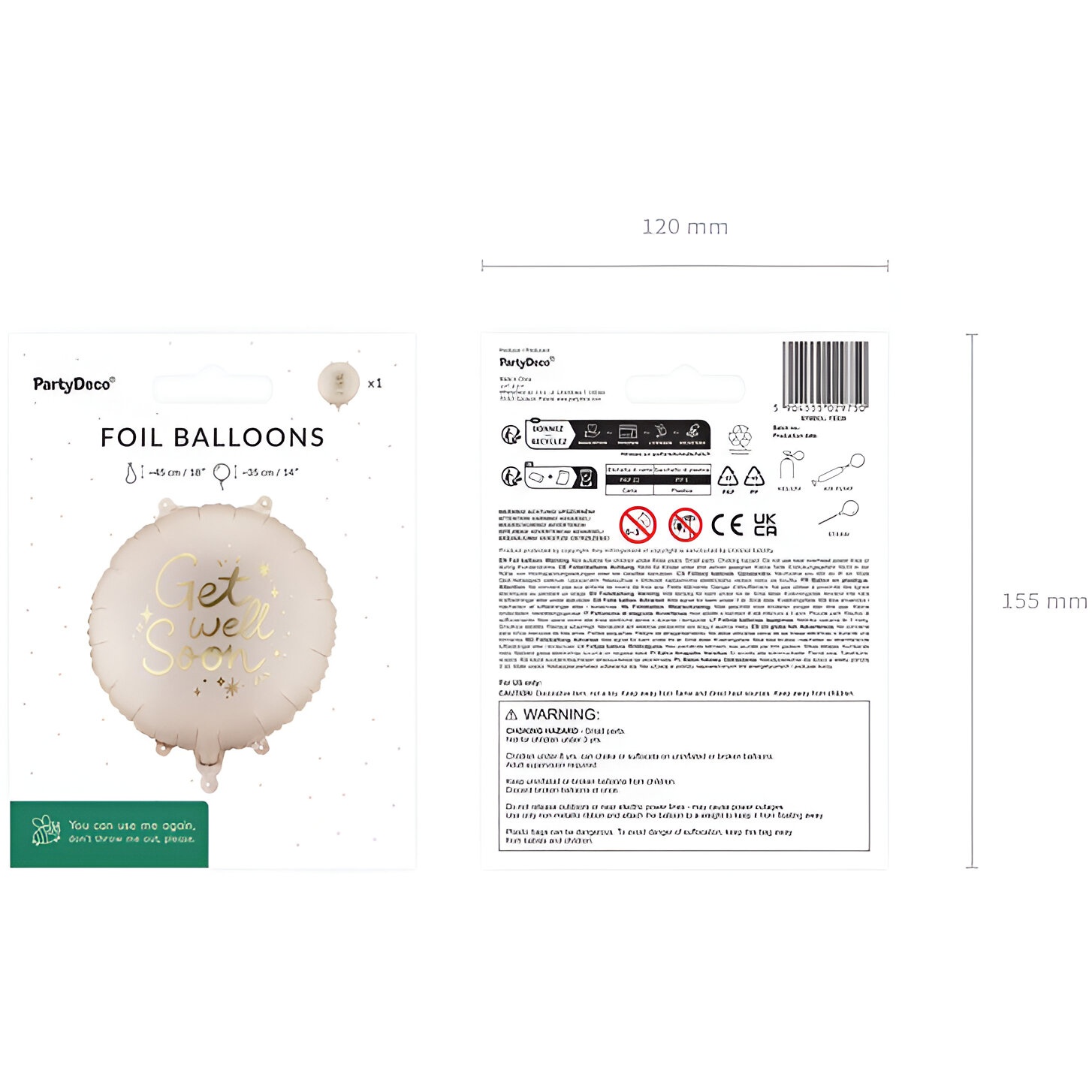 Ballon rond en film métallisé portant l'inscription réconfortante « Get Well Soon » en doré élégant sur fond beige. Idéal comme attention pour vos visites ou pour accompagner vos cadeaux de rétablissement, il apporte une touche sophistiquée et bienveillante. Se gonfle à l'air ou à l'hélium ; le film métallisé lui permet de garder sa forme. Dimensions approximatives après gonflage: 35 x 35 cm.