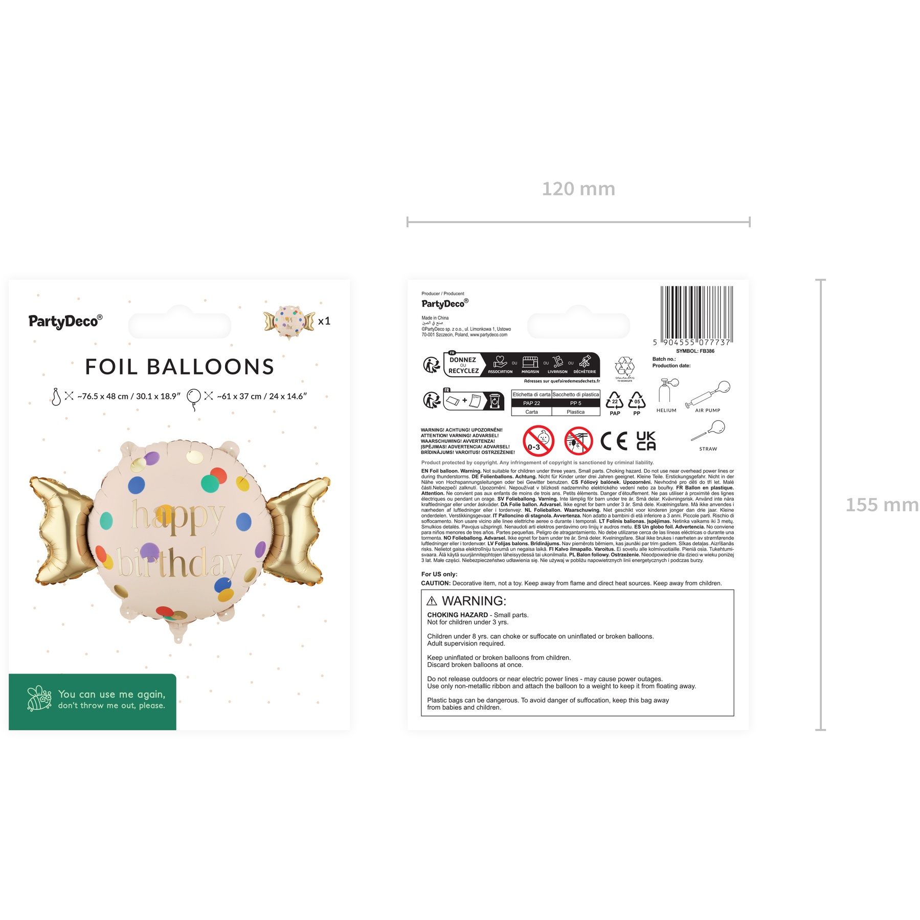 Ballon Candy "Happy Birthday" dans des tons beiges avec détails dorés, décoré de confettis multicolores et portant l'inscription "happy birthday" en finition brillante.