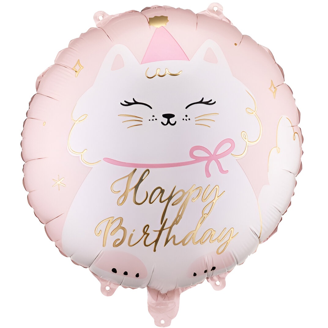 Ballon en foil de forme ronde avec un motif de chaton et l'inscription « Happy Birthday » en détails dorés. Couleurs mixtes aux tonalités douces, pensées pour les célébrations d'enfants.