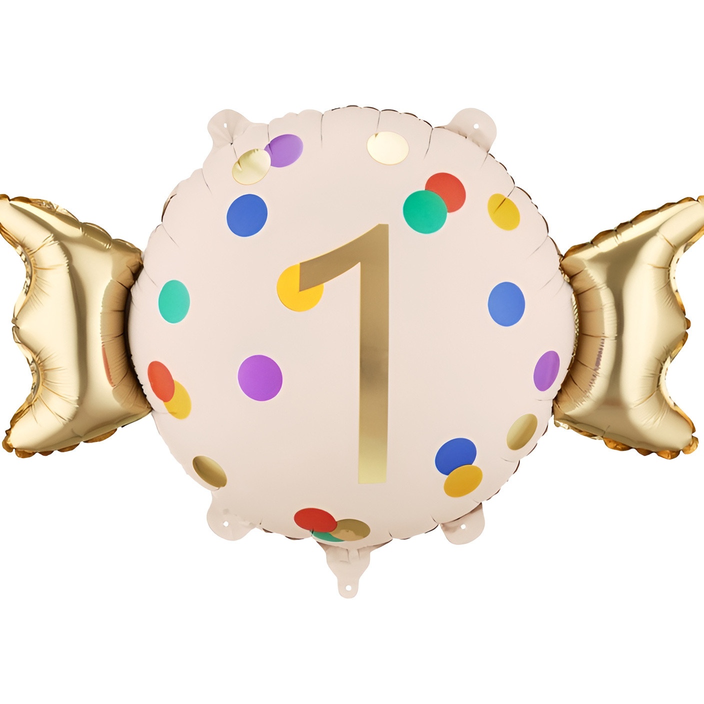 Ballon décoratif arborant le chiffre 1 dans une combinaison beige et dorée élégante. Son design « bonbon » à pois multicolores apporte une touche festive et sophistiquée. Dimensions approximatives avant gonflage: 76,5 x 48 cm ; après gonflage: 61 x 37 cm. Gonflable à l'air ou à l'hélium, il est pensé pour devenir le point focal de votre célébration. Idéal pour un premier anniversaire, des séances photo et pour décorer tables de desserts ou coins spéciaux.
