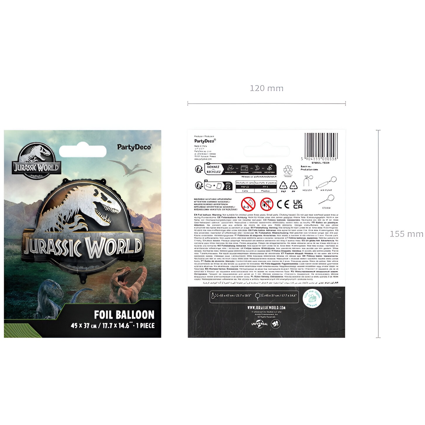 Ballon foil arborant l'iconique logo Jurassic World, idéal pour immerger vos célébrations enfantines dans une ambiance d'aventure et de dinosaures. Dimensions approximatives avant gonflage: 55 x 47 cm ; après gonflage: env. 45 x 37 cm. Se gonfle à l'air ou à l'hélium et offre une finition brillante qui rehausse la décoration. Design accrocheur et couleurs mélangées, faciles à associer avec d'autres éléments de fête.