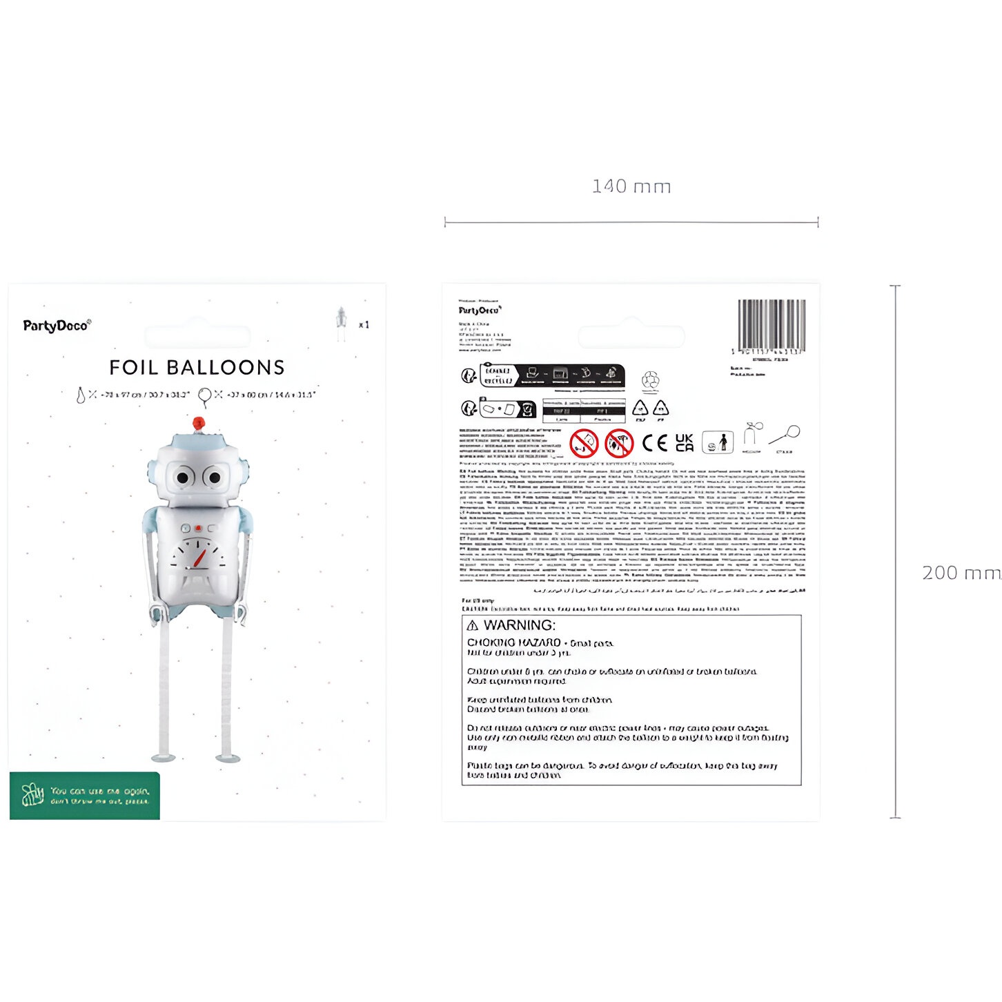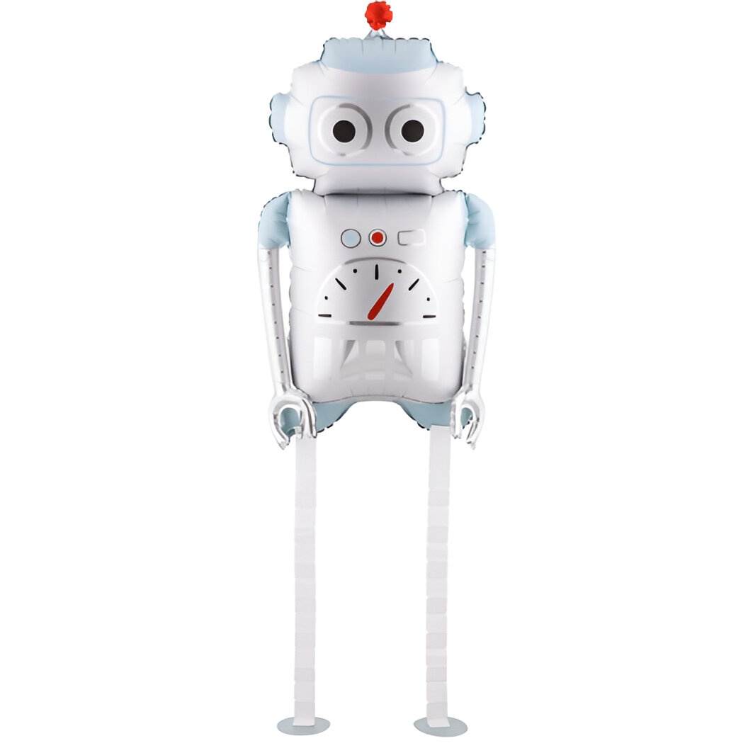 Ballon foil au motif robot "Walking" dans des tons argentés et bleu clair. Sa silhouette élancée et ses jambes pendantes créent un effet ludique et distinctif qui attire les regards. Les dimensions avant gonflage sont env. 78 x 97 cm ; après gonflage il mesure env. 37 x 80 cm, avec une hauteur des jambes d'environ 45 cm. Recommandé pour un gonflage à l'hélium, il est idéal pour apporter un point focal lors d'anniversaires et autres célébrations pour enfants.