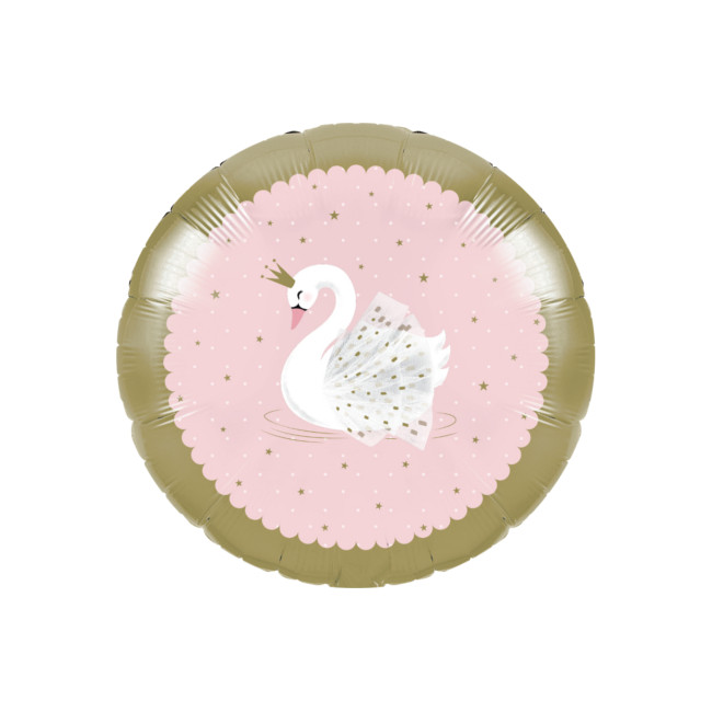 Ballon en aluminium rond avec un magnifique cygne au centre sur un fond rose avec des petites étoiles et un bord doré. Les deux faces ont le même design.