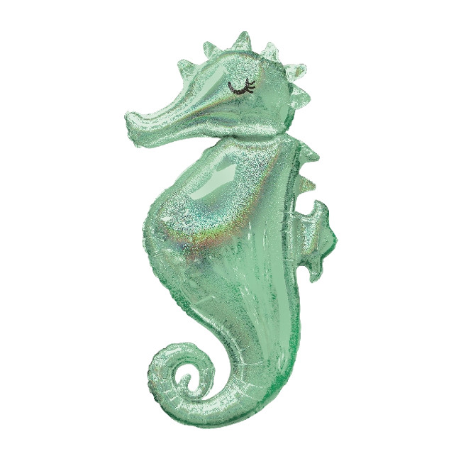 Fabriqué en papier d'aluminium, cet impressionnant ballon de dimensions XL reproduit la silhouette d'un hippocampe de couleur vert sarcelle avec une finition pailletée. Il peut être gonflé à l'air ou à l'hélium, si vous souhaitez qu'il flotte et reste en position verticale.