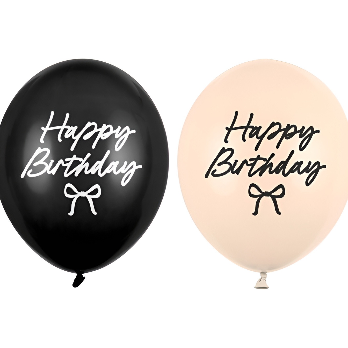Ces ballons "Happy Birthday", ornés d'un noeud, ont été conçus pour apporter une touche sophistiquée à toutes vos célébrations. Les teintes noir et nude créent une esthétique sobre et élégante, idéale pour des décors minimalistes comme pour des mises en scène plus élaborées. L'impression recto-verso garantit la lisibilité du message sous tous les angles et le format généreux renforce la présence des bouquets, centres de table et photocalls.
