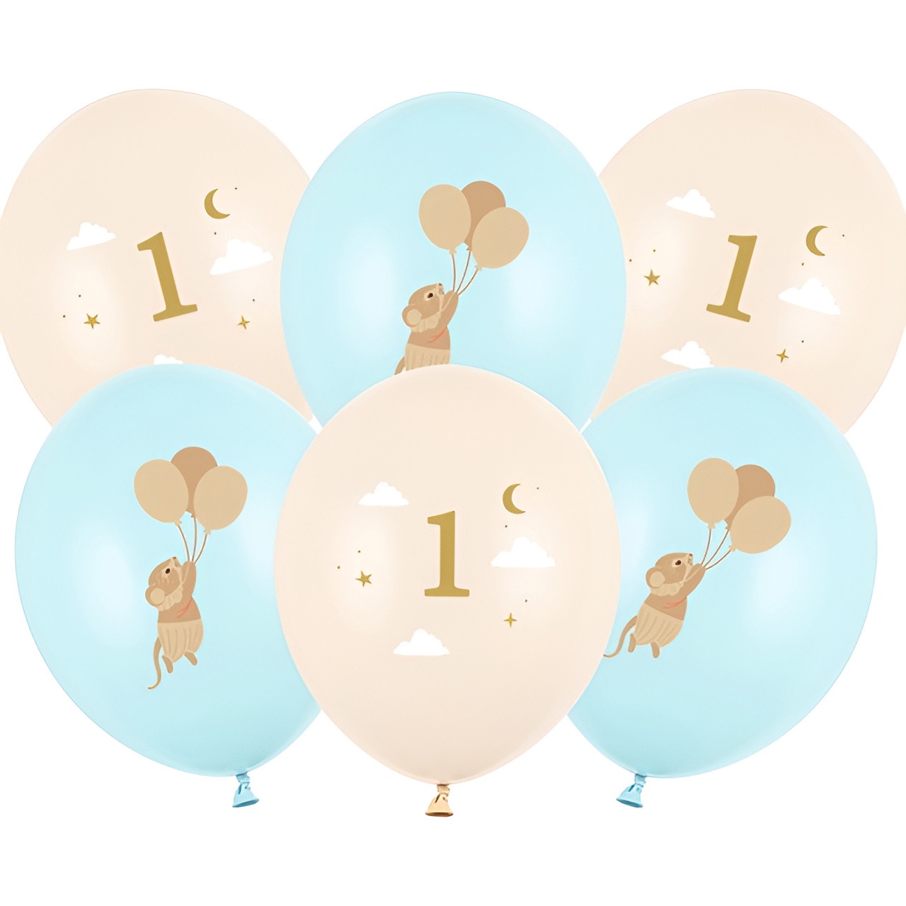 Ballons idéaux pour célébrer le premier anniversaire avec un motif tendre de souris et le chiffre 1 en tons pastel, apportant une touche délicate à la décoration.