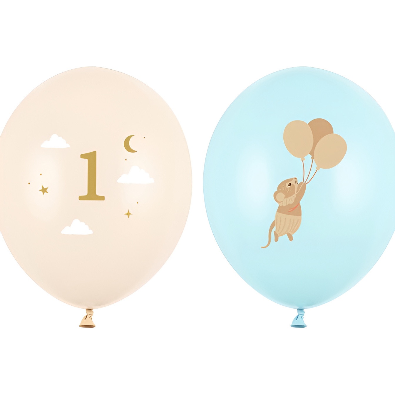 Ces ballons décoratifs au motif tendre de souris et au chiffre 1 sont conçus pour mettre en valeur le premier anniversaire de votre enfant. Ils bénéficient d'une impression recto-verso afin que le motif soit visible quel que soit l'angle. Les tons pastel apportent une atmosphère douce et élégante, parfaitement adaptée aux décorations infantiles et aux thèmes neutres. Diamètre approximatif de 30 cm une fois gonflés ; présentation en lot de grande quantité pour décorer facilement.