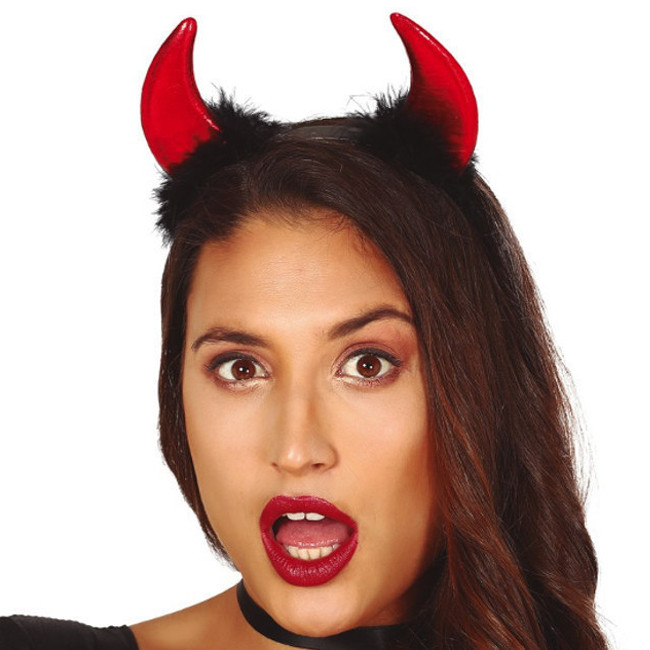 Un serre-tête noir avec deux petites cornes en tissu rouge métallisé avec rembourrage. Il est accompagné de poils noirs et est indispensable si vous souhaitez vous transformer en un véritable démon ou diablesse lors de la nuit la plus terrifiante de l'année ou lors de toute fête à thème.