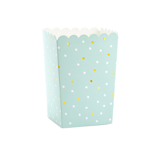 Ce produit est composé de 6 boîtes en carton de couleur vert aigue-marine, décorées de pois blancs et dorés. La partie supérieure de chaque boîte présente un bord festonné, très attrayant.