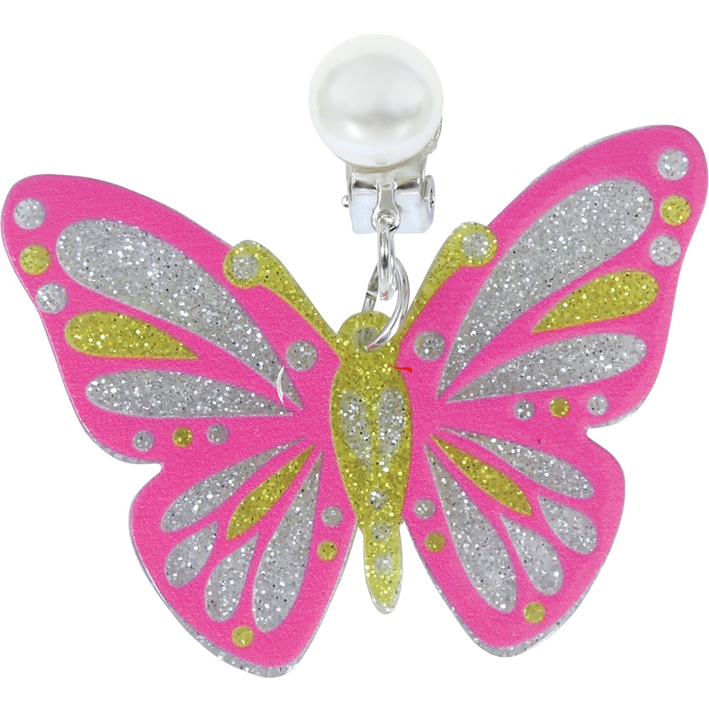 Charmantes boucles d'oreilles au motif papillon, conçues pour les fillettes. Elles se distinguent par leur couleur rose et leurs touches de paillettes qui apportent une note festive et scintillante. Légères et confortables, elles sont parfaites pour les fêtes, les anniversaires et comme accessoire de déguisement. Elles possèdent un fermoir clip orné d'une perle, facile à mettre et sécurisé pour les oreilles non percées. Matériaux: métal et PVC.