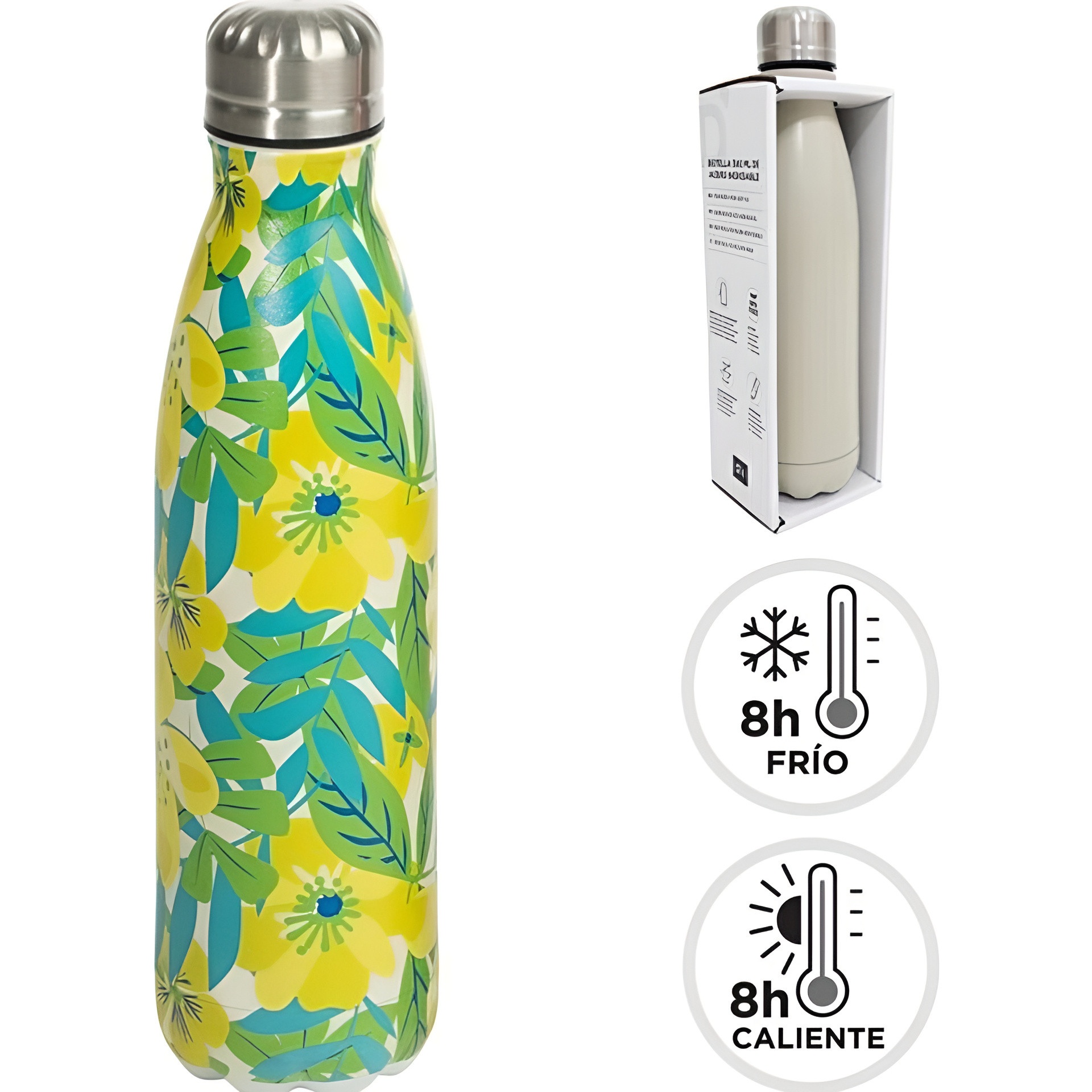 Bouteille isotherme à double paroi au motif tropical vibrant, qui ajoute du style à votre quotidien. Conçue pour maintenir la température de vos boissons pendant des heures, elle conserve aussi bien la fraîcheur que la chaleur. Son format compact et sa fermeture sécurisée la rendent facile à transporter dans votre sac ou votre sac à dos. Une option élégante et écoresponsable pour réduire l'usage d'emballages jetables.