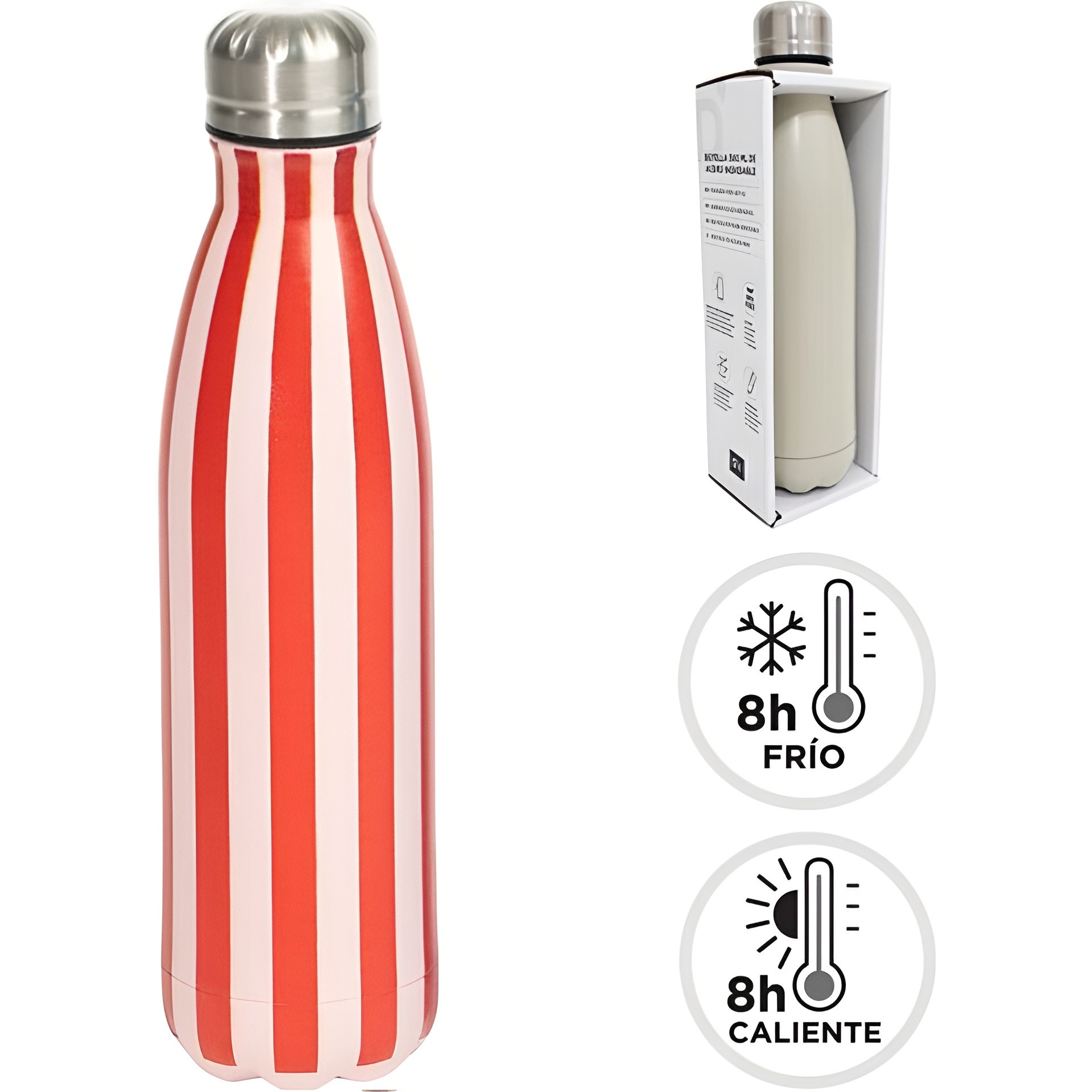 Bouteille isotherme à rayures qui allie style et fonctionnalité. Son format compact et son bouchon hermétique en font l'alliée idéale pour emporter votre boisson préférée tout au long de la journée. Réutilisable et pensée pour vous qui recherchez une solution pratique et pleine de personnalité. Parfaite pour votre routine quotidienne, le sport ou vos déplacements.