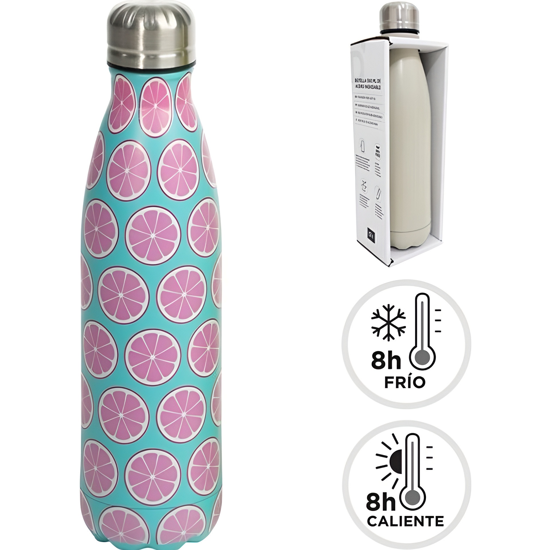 Bouteille isotherme au motif fruité et coloré, parfaite pour emporter vos boissons préférées avec style. Son design moderne et joyeux apporte une touche ludique à votre quotidien. Légère et facile à transporter, elle est idéale au bureau, à la salle de sport ou lors de vos sorties en plein air.
