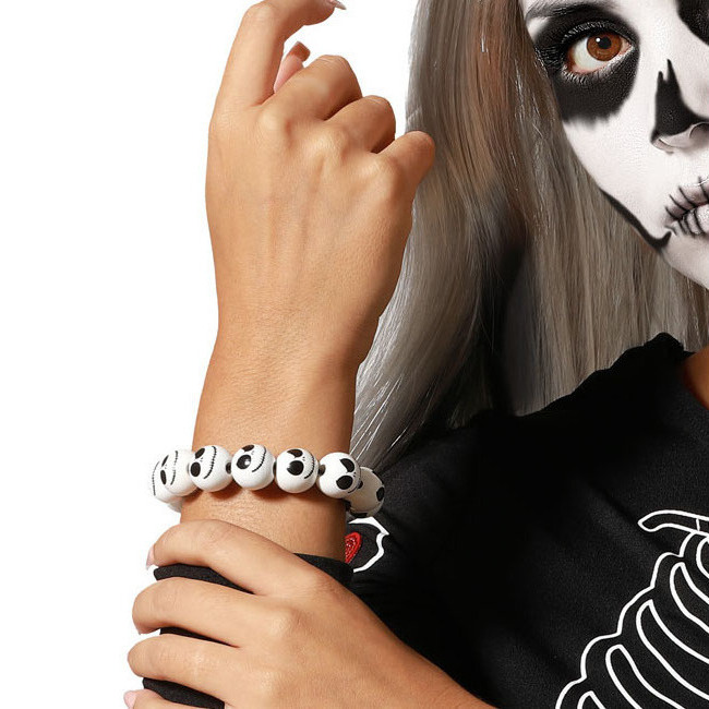 • Bracelet avec perles et têtes de mort décoratives. Accessoire idéal pour des tenues sombres ou squelettiques.