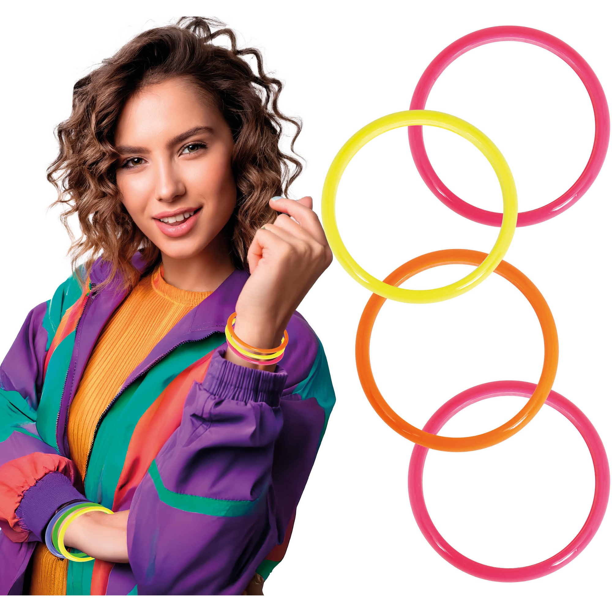Bracelets néon en PVC inspirés du style rétro des années 80, parfaits pour parfaire votre look vintage ou votre tenue de fête.