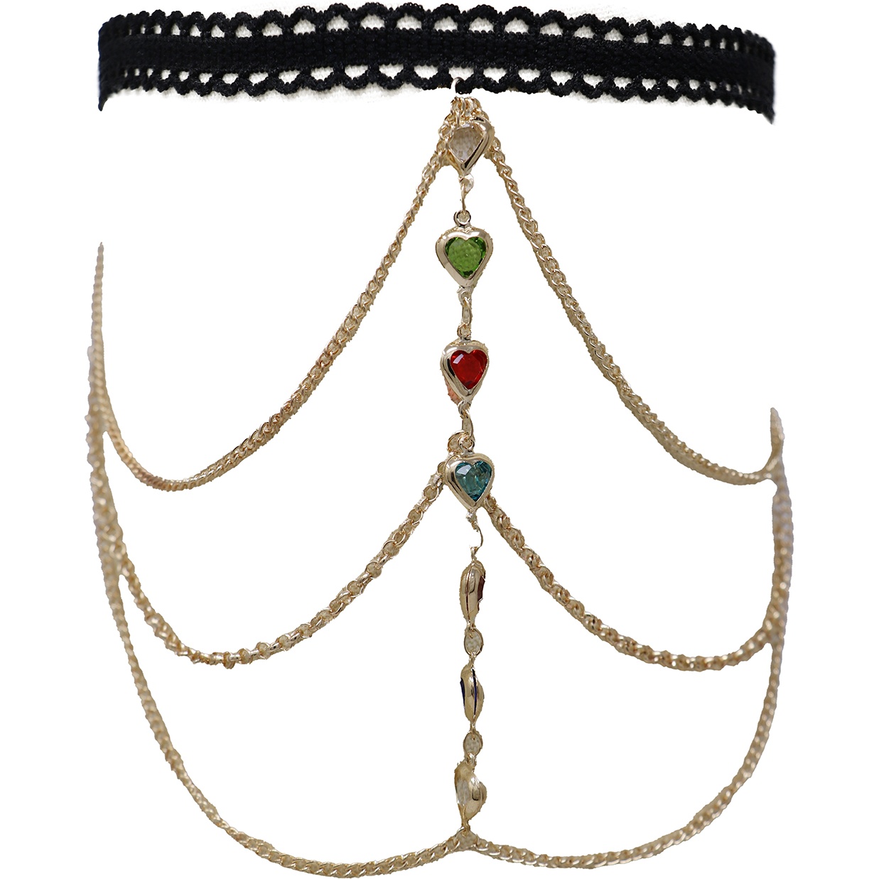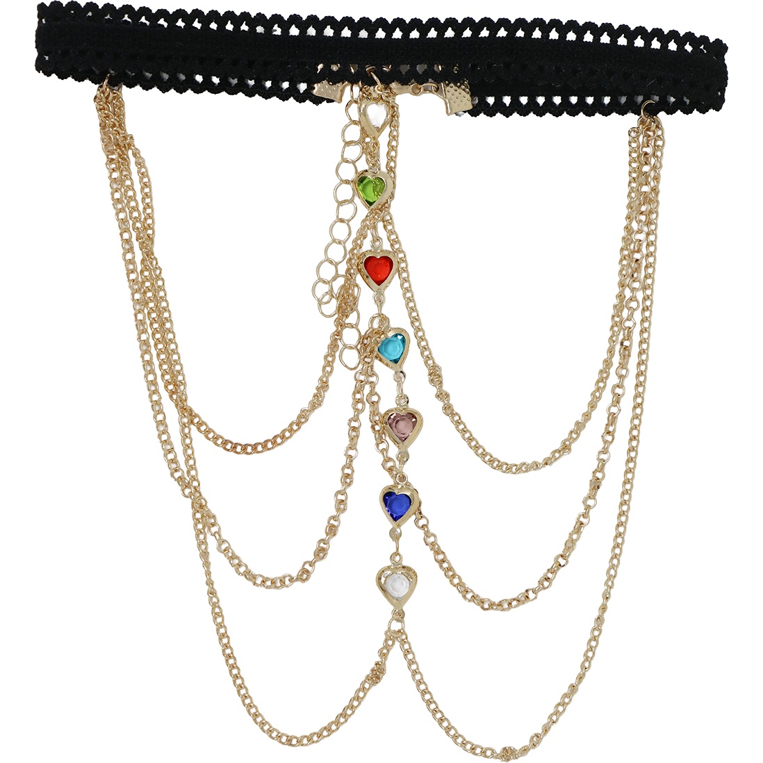Il est doté d'une bande élastique en PVC et de plusieurs chaînes dorées superposées, décorées de petites pierres colorées qui scintillent au moindre mouvement.