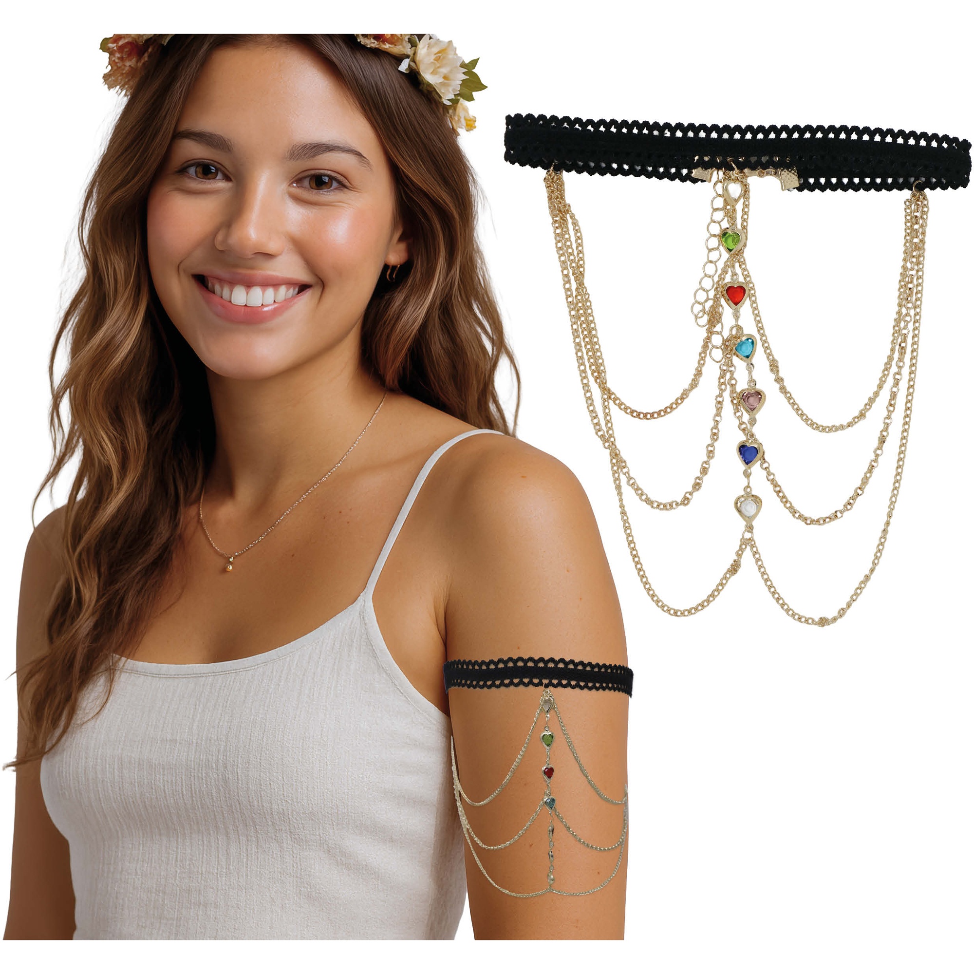 Ce brassard boho, orné de pierres colorées et de chaînes, apporte une touche féminine et festive à toutes vos tenues.