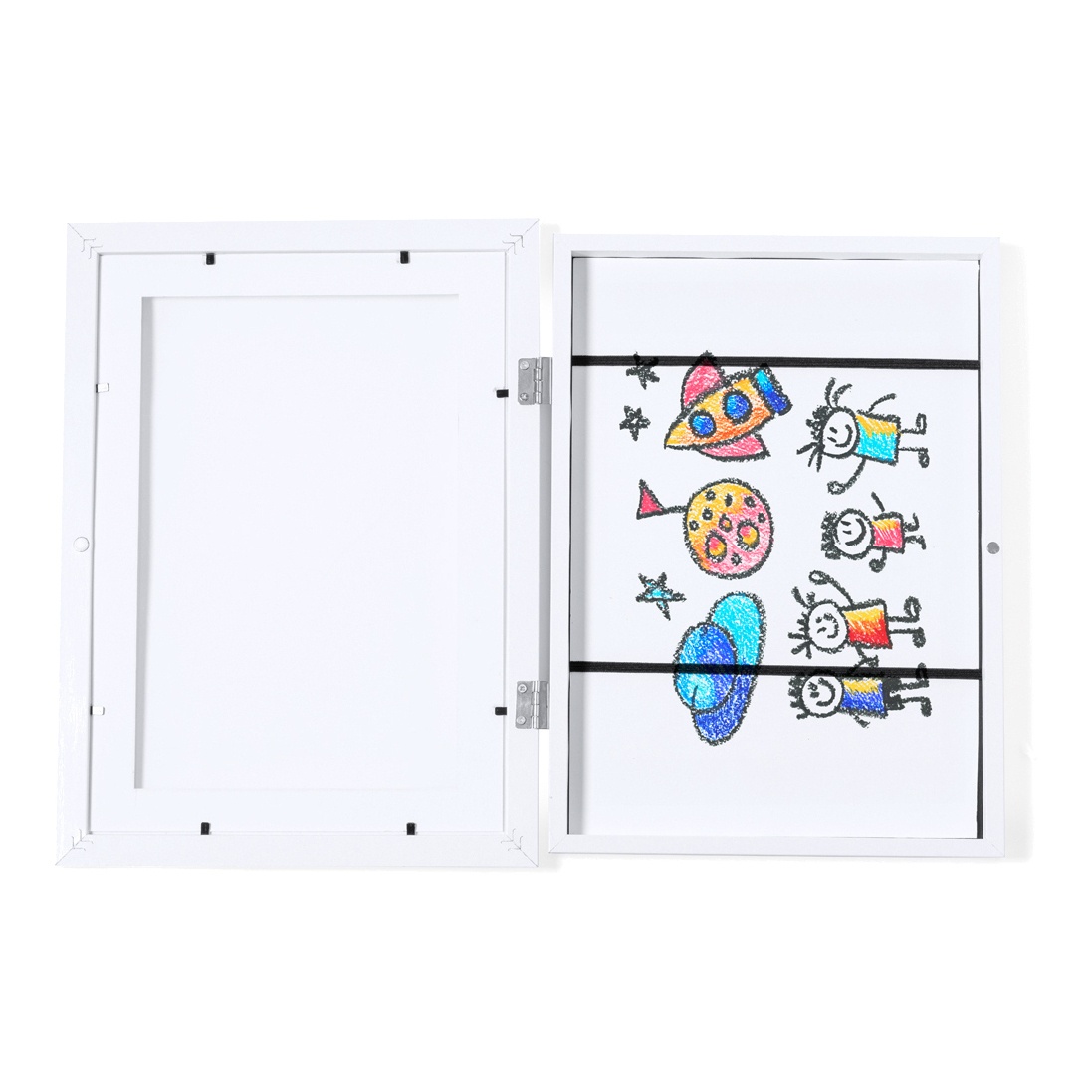 - Offre un compartiment pour ranger des dessins de taille A4 maintenus par des bandes élastiques, tandis que sur sa couverture, il intègre un cadre pour mettre en valeur le dessin choisi.