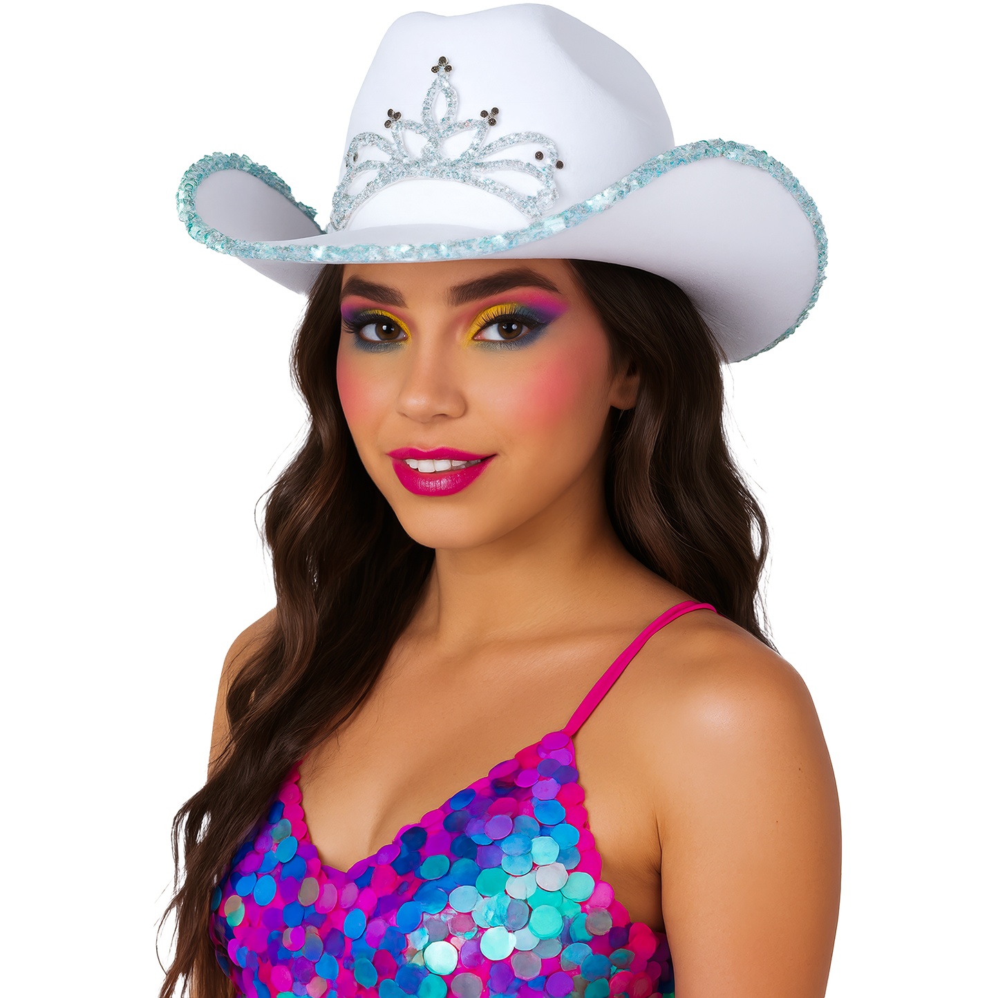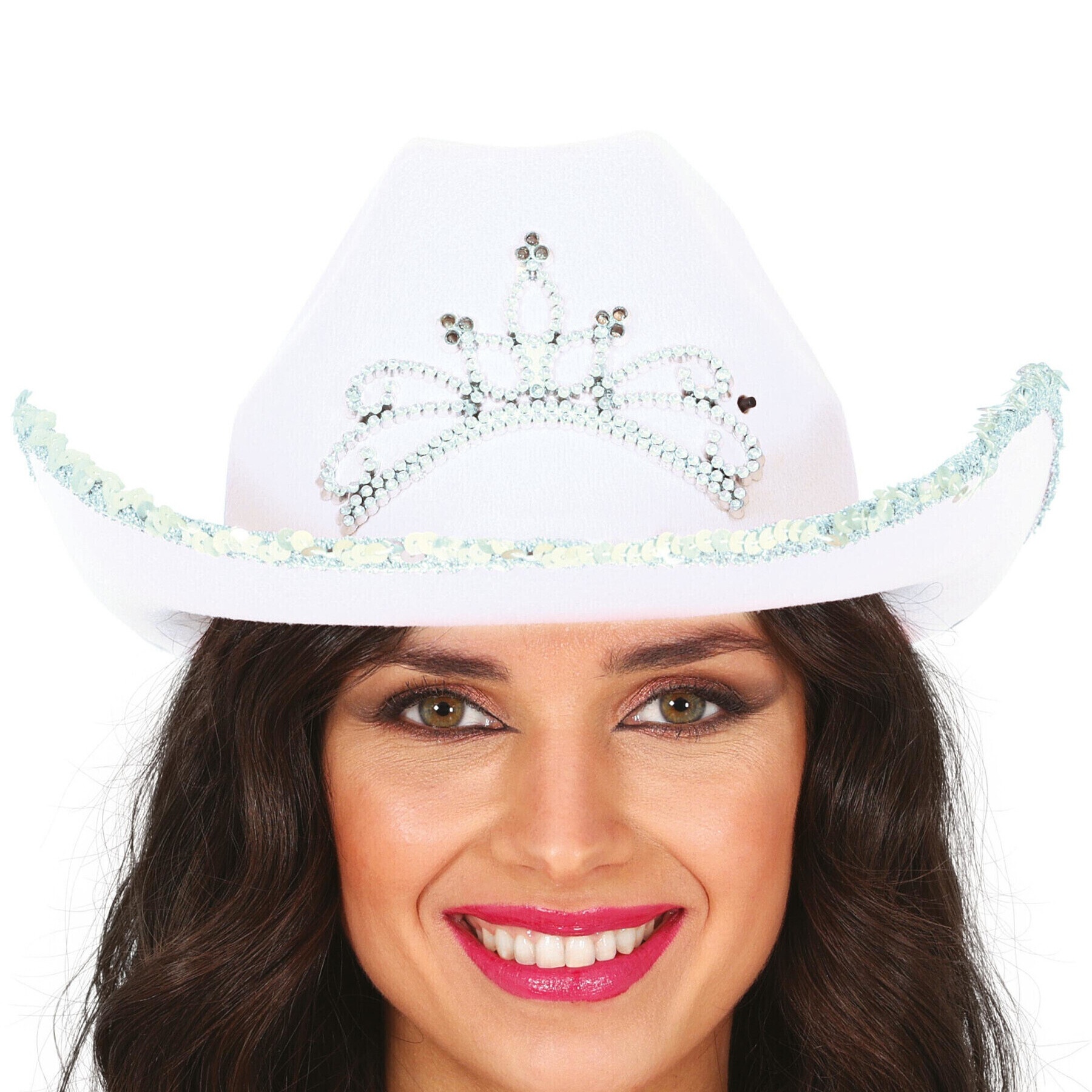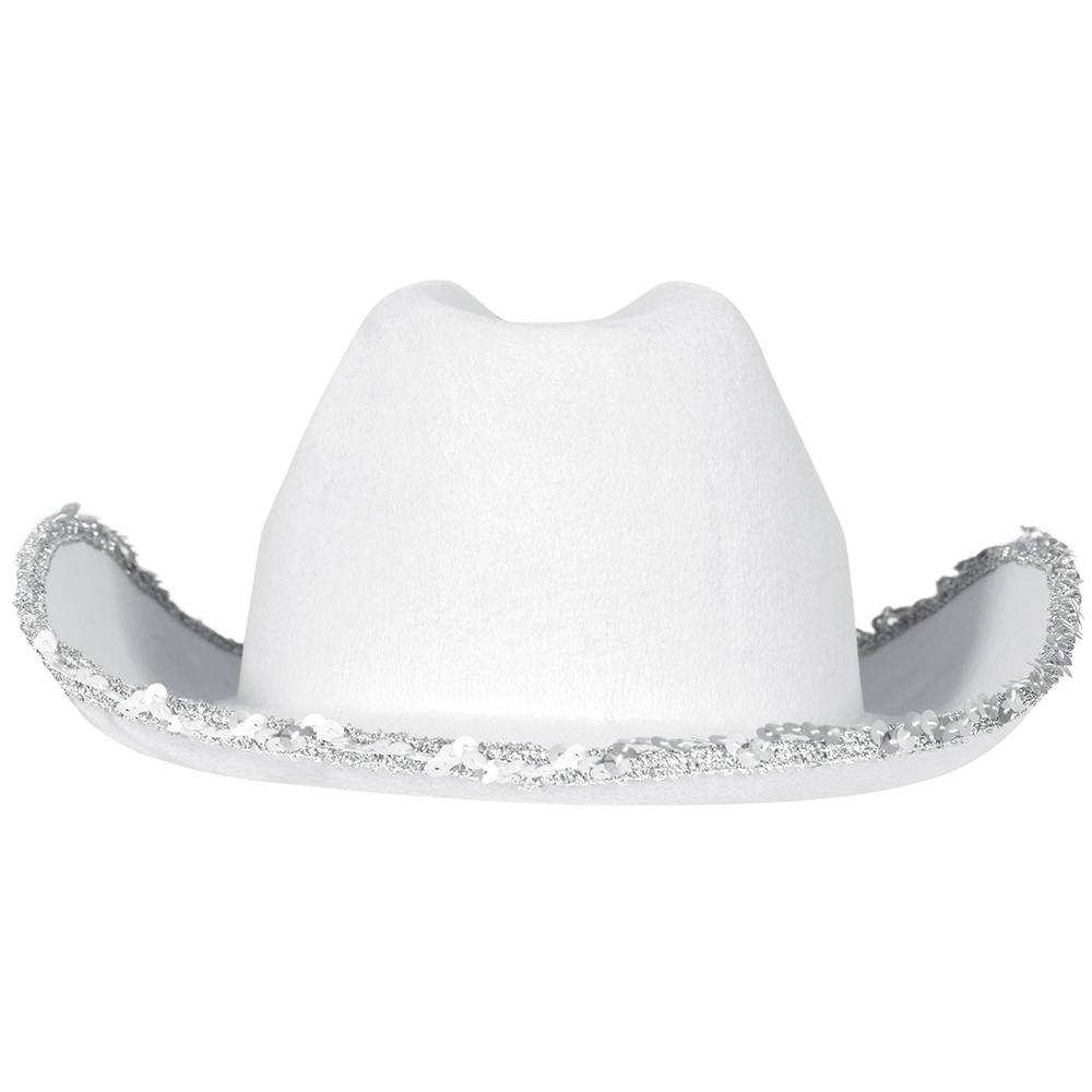 Chapeau de cow?girl rose, orné d'une élégante couronne en strass et d'une bordure décorée de paillettes. Il associe le style cow?boy classique à une touche féminine et brillante.