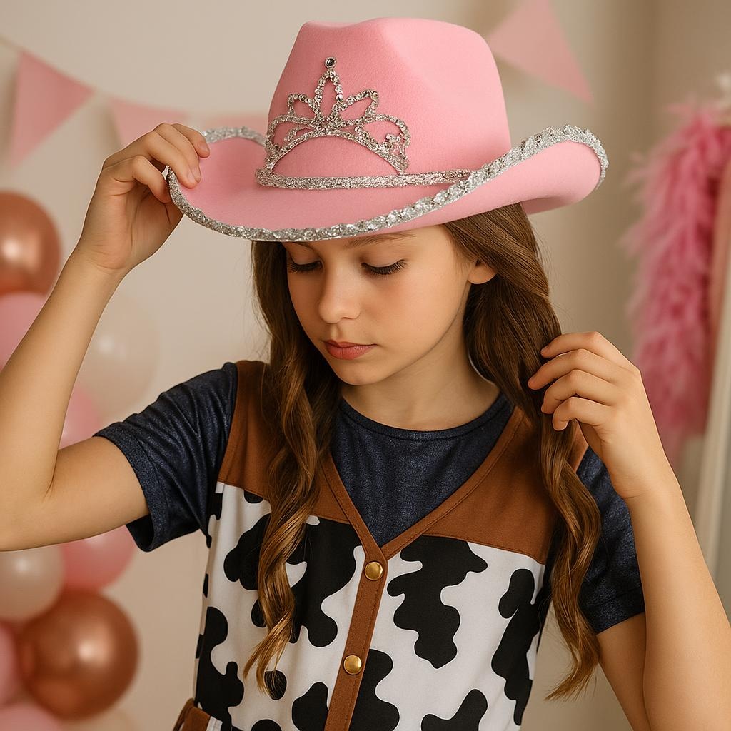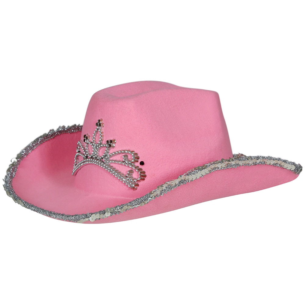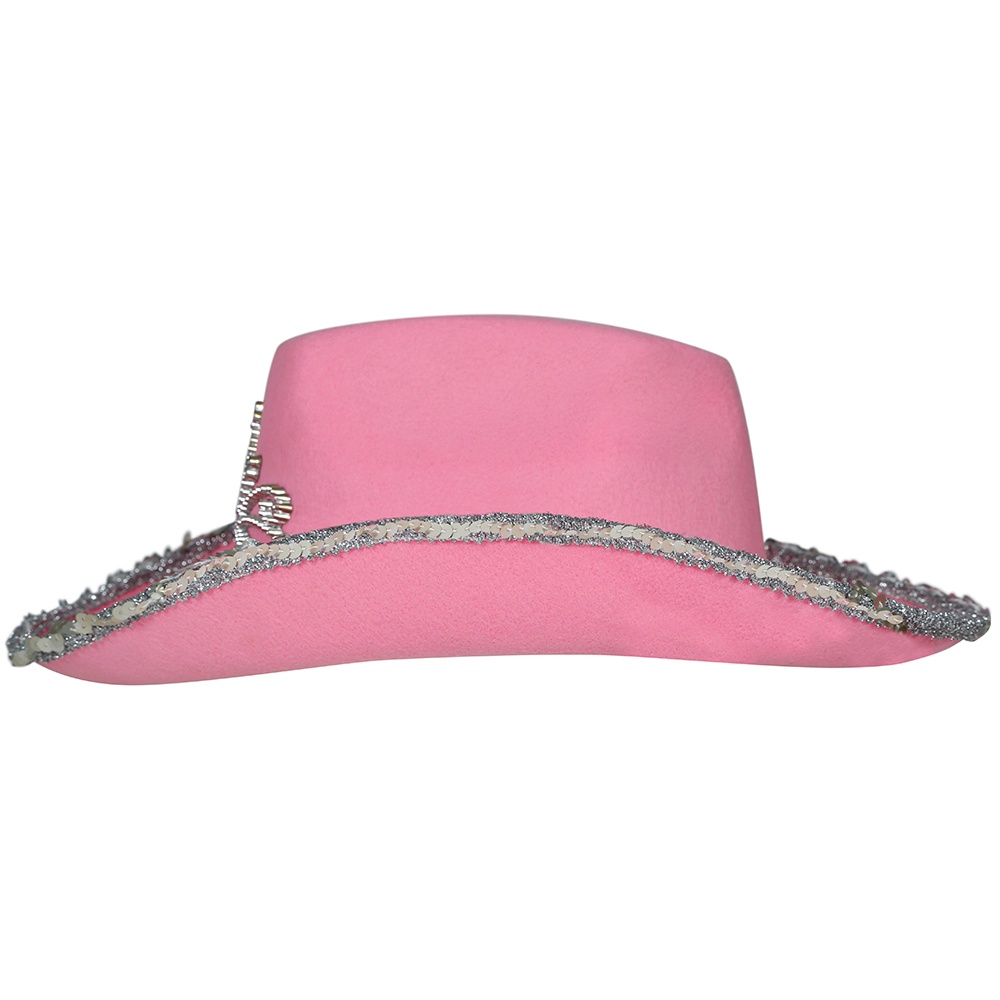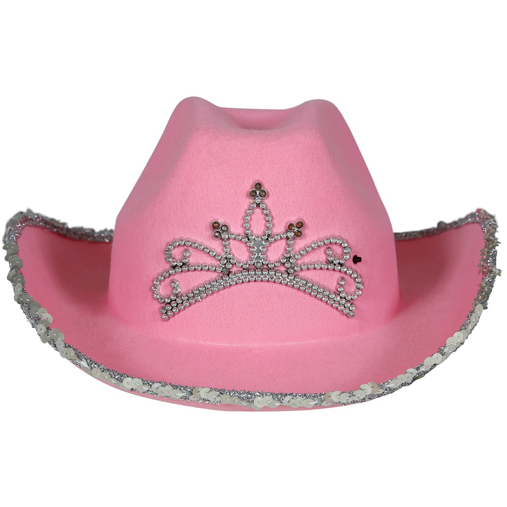 Offrez à votre fille un chapeau de cow?girl rose, parfait pour celles qui recherchent une touche ludique et brillante. Il présente un liseré de paillettes argentées sur le bord et un motif style diadème serti de strass sur la calotte, pour un look de princesse cow?girl.