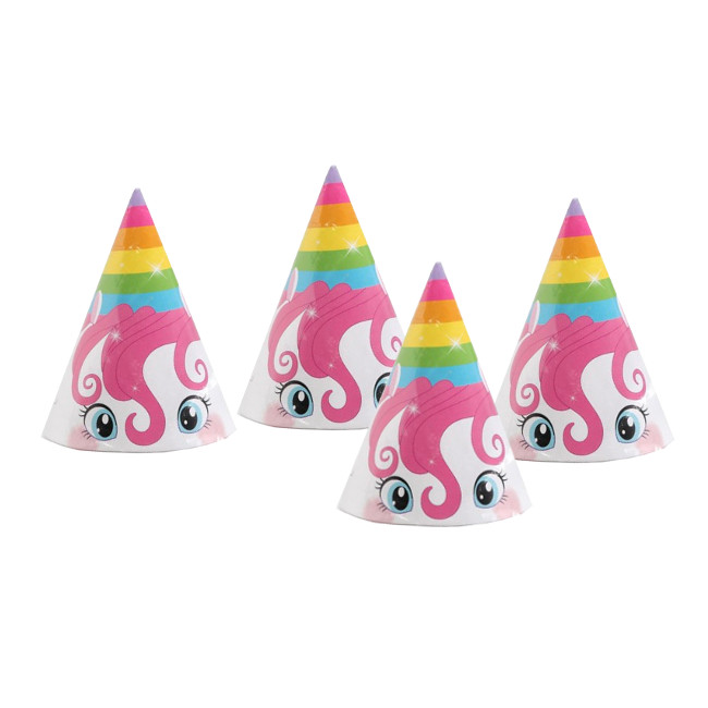 Ce produit contient 6 chapeaux festifs, fabriqués en carton avec une forme pointue. Chaque unité a été décorée avec le visage d'une licorne douce de style 'cartoon'; elle apparaît avec une crinière fuchsia et une corne multicolore, qui correspond à l'extrémité supérieure du chapeau.