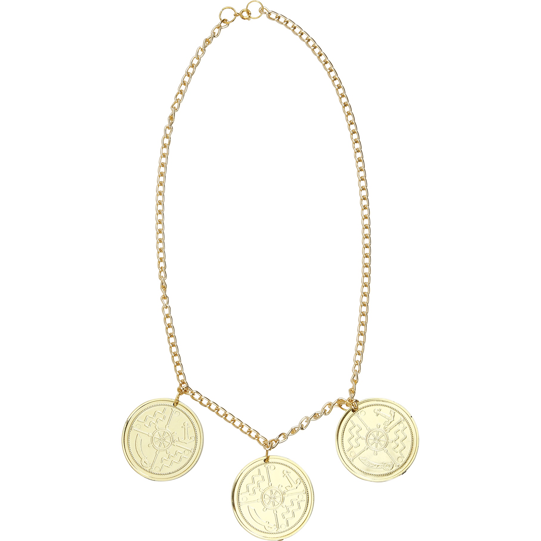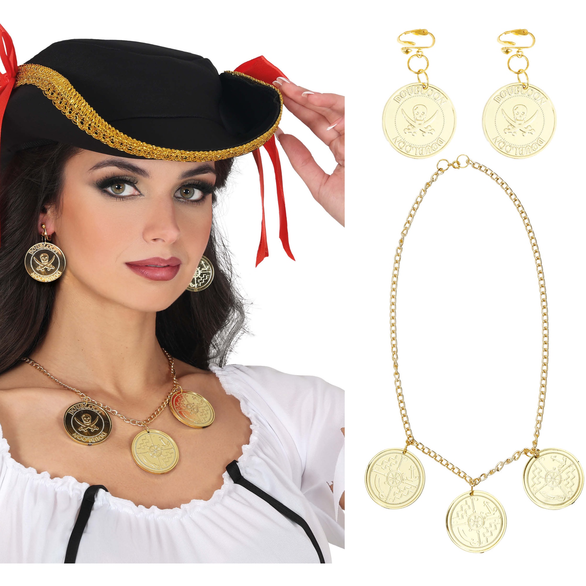 Ensemble collier et boucles d'oreilles à pièces de style pirate, conçu pour femme adulte. Il présente une finition dorée simulant d'anciennes monnaies et apporte une touche théâtrale et saisissante à votre tenue. Fabriqué en PVC léger pour vous assurer un port confortable pendant fêtes et événements. Parfait pour le Carnaval et les fêtes à thème, il confère du caractère à tout costume de pirate. Se combine aisément avec chapeaux, chemisiers et autres accessoires de déguisement.