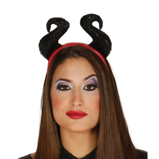 Serre-tête rouge avec des cornes noires rembourrées pour qu'elles gardent leur forme.