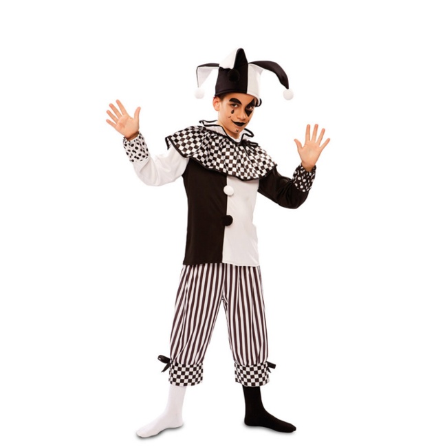 Ce costume est composé d'un chapeau de bouffon en noir et blanc, avec des pompons blancs aux extrémités pendantes. Il est assorti d'une chemise des mêmes couleurs, ornée d'une sorte de pèlerine à carreaux noirs et blancs, le même motif apparaissant aux poignets. Il comprend un pantalon à rayures verticales noires et blanches, avec un bord inférieur décoré de carreaux et orné d'un petit noeud noir.