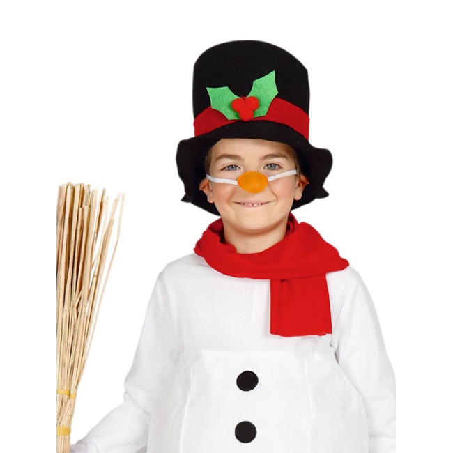 Le pantalon est blanc et a un élastique à la taille. Le chapeau est en feutre noir avec une bande rouge et un détail à l'avant. Le nez, orange et pointu, est attaché avec un élastique et se ferme par un velcro.