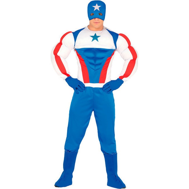 Il se compose d'une combinaison avec la partie supérieure dans des couleurs qui rappellent le drapeau américain et une étoile bleue au centre de la poitrine, où le tissu est également rembourré pour donner un effet musclé. La partie du pantalon est entièrement bleue et NE COMPREND PAS de couvre-bottes comme on le voit sur la photo.