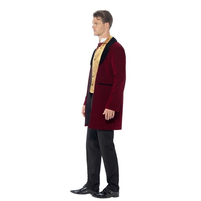 Un modèle de véritable chevalier d'époque composé d'une élégante veste en velours d'un rouge intense avec des revers noirs et des boutons, un faux gilet en tissu satiné de couleur dorée avec un joli imprimé de feuilles et une cravate assortie à la veste.