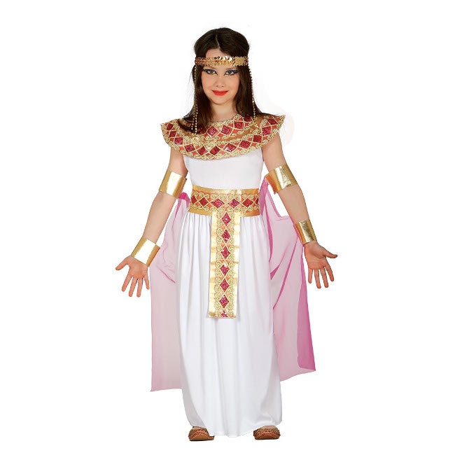 Ce modèle de style égyptien se compose d'une longue tunique blanche avec un col décoré en or et rose. La cape en tissu de tulle rose est attachée à des bracelets dorés et la ceinture suit le même design que le col.