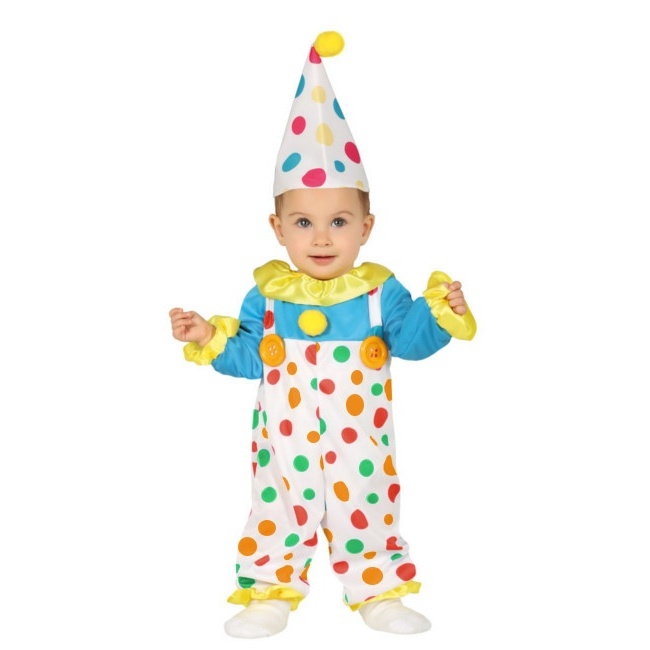 Modèle amusant de petit clown pour les plus petits. Composé d'une combinaison avec l'effet de porter une salopette blanche à pois colorés et une chemise bleue aux bords jaunes, cette partie forme une seule pièce très confortable à porter.