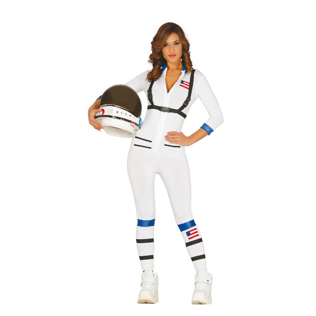 Déguisement de pilote spatial pour femme. Une combinaison de couleur blanche avec fermeture avant par fermeture éclair. Tant sur les manches, que sur le corps et les jambes, il y a des détails en noir et bleu ainsi que le drapeau américain pour compléter le look spatial.