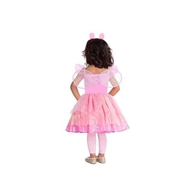 Cette version féerique du costume de Peppa Pig est parfaite pour faire de la magie. La robe comporte un corsage imprimé Peppa Pig, des manches en tulle, une ceinture fleurie et une adorable jupe imprimée. Il y a aussi une paire d'ailes transparentes avec un cadre en fil de fer et du velcro pour les attacher dans le dos, ainsi qu'un bandeau avec de mignonnes petites oreilles roses.