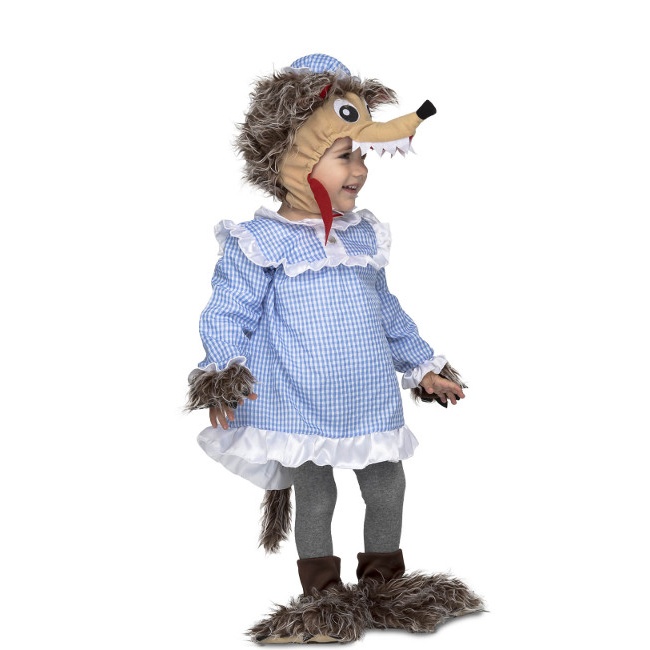 Composé d'une chemise de nuit classique à carreaux bleus et blancs. Au bout des manches, il y a des couvre-mains avec l'effet de mains poilues avec des griffes. La queue du loup est cousue au dos de la robe.
