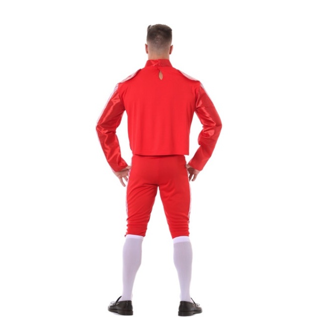 La cravate est également cousue à la veste, ce qui rend ce modèle très confortable à porter. Le pantalon a un élastique à la taille et sur les côtés, il présente les mêmes détails avec du tissu en dentelle blanche et des bordures dorées que la veste.