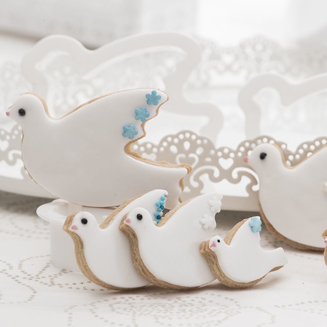 Kit de 3 emporte-pièces en forme de pigeon de différentes dimensions pour créer de belles décorations de sucre ou de biscuits.