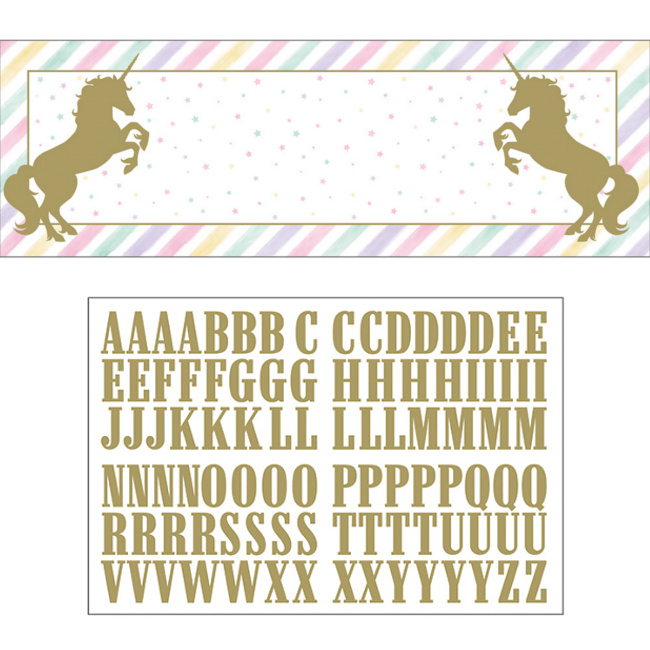 Cette fresque très attrayante se compose d'une feuille plastique contenant une multitude de voyelles et de consonnes en doré, pensées pour former le nom de l'heureux enfant fêté sur un fond blanc avec un motif étoilé. La présence de deux chevaux cabrés en doré attire sans doute l'attention des plus petits.