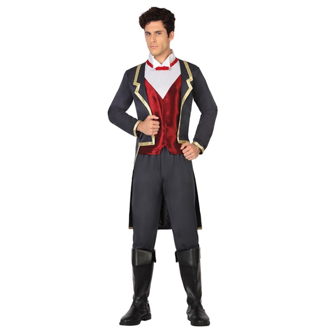 Il se compose d'un habit en gris anthracite avec un gilet de couleur rouge carmin et un col blanc avec un noeud papillon rouge. La redingote présente une traîne à l'arrière, est courte à l'avant et est bordée de doré.