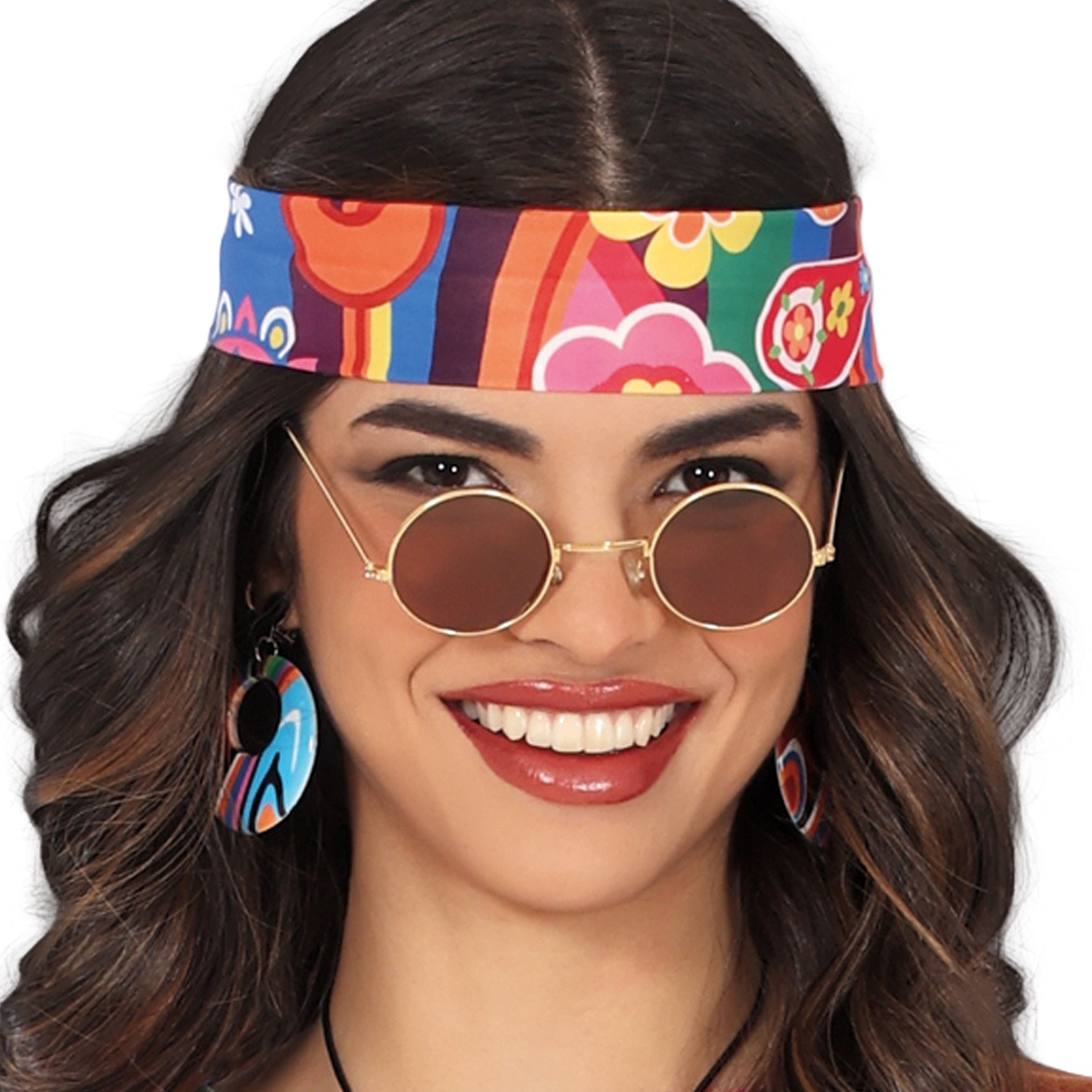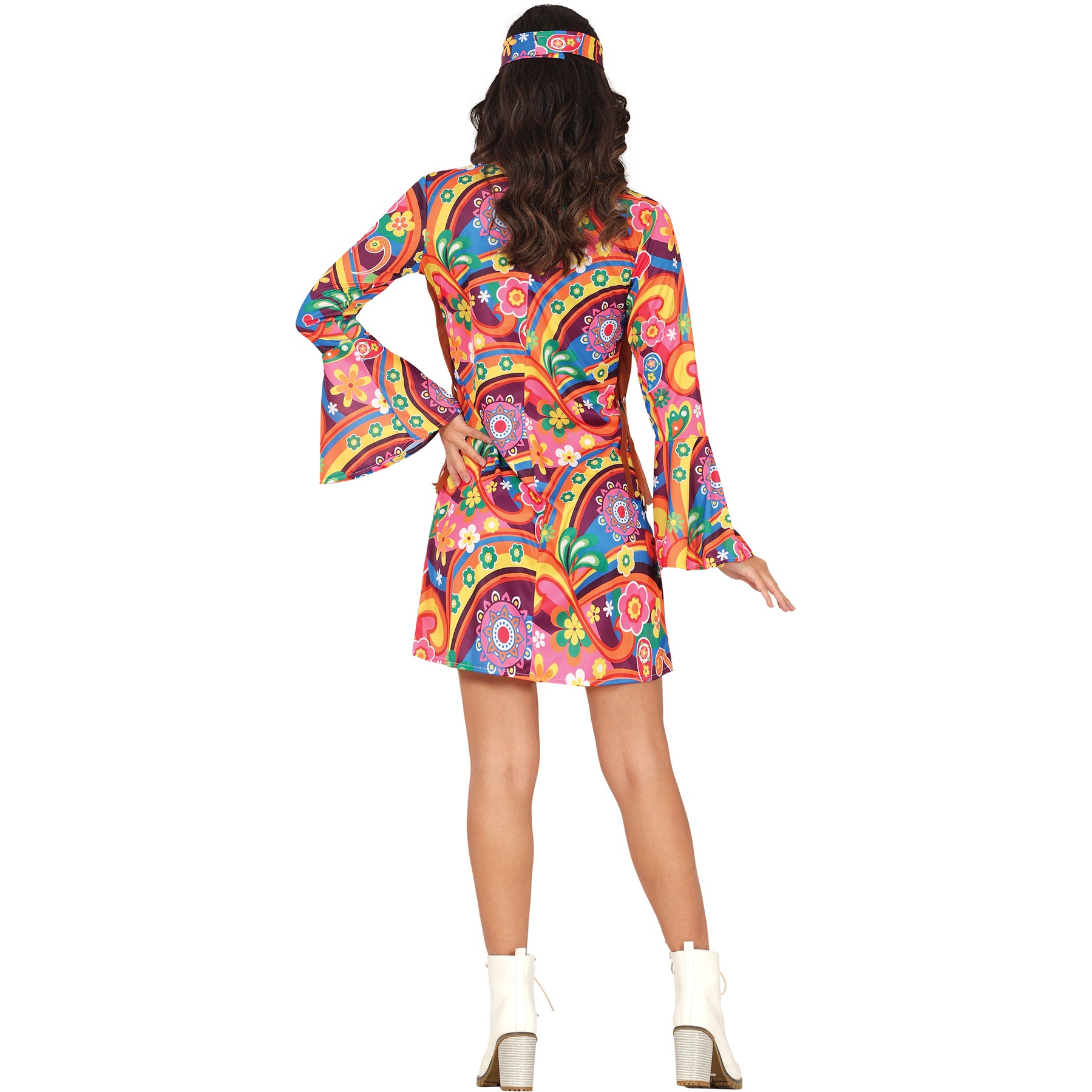 Coloré déguisement de femme hippie des années soixante-dix avec lequel vous triompherez lors des carnavals, anniversaires et fêtes à thème en général. Paix et amusement garantis!