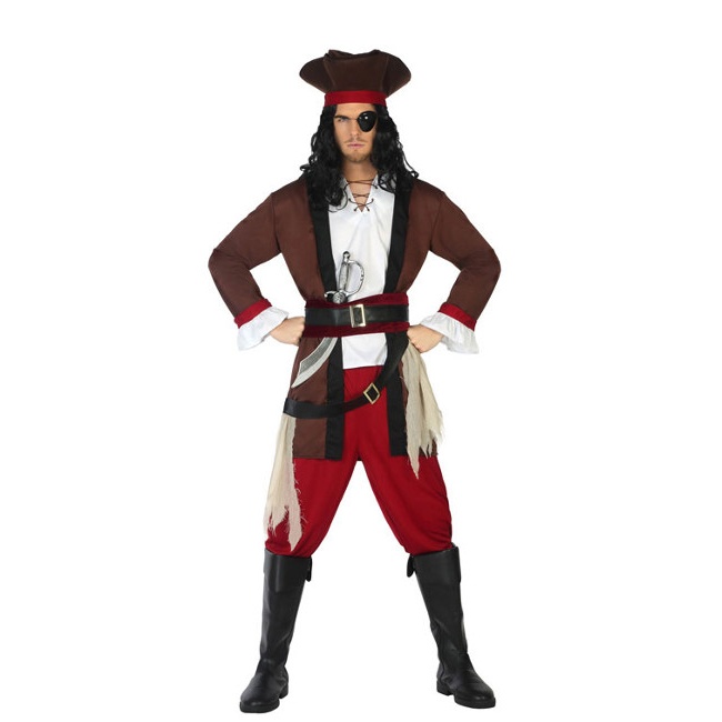 Cette chemise est fermée par une ceinture plus large qui s'attache dans le dos avec du velcro. Il est complété par un pantalon rouge et un chapeau en tissu.