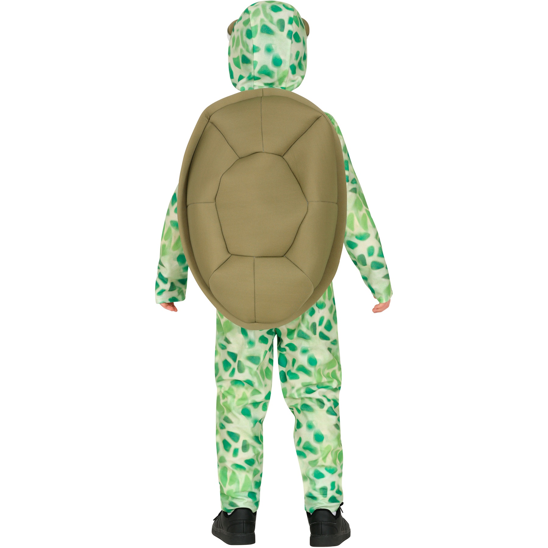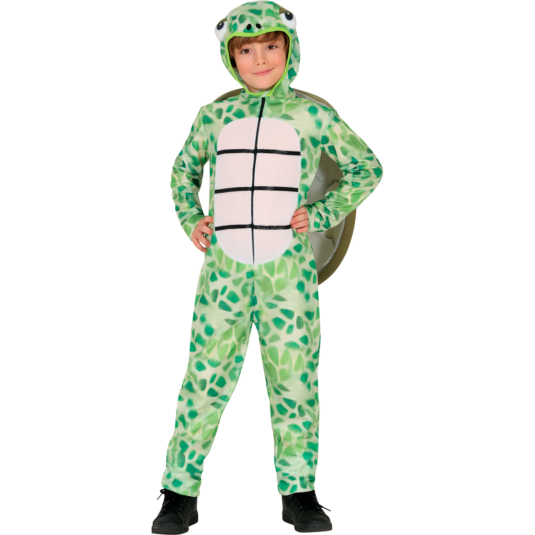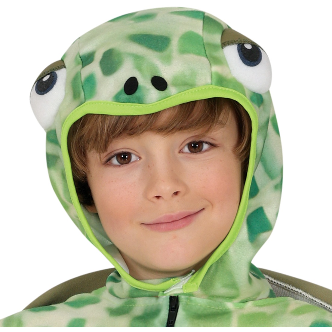 Beau modèle pour enfants représentant une tortue, composé d'une combinaison avec un joli motif de feuilles imprimé. La capuche est attachée à la combinaison, qui dispose d'une fermeture éclair à l'avant.