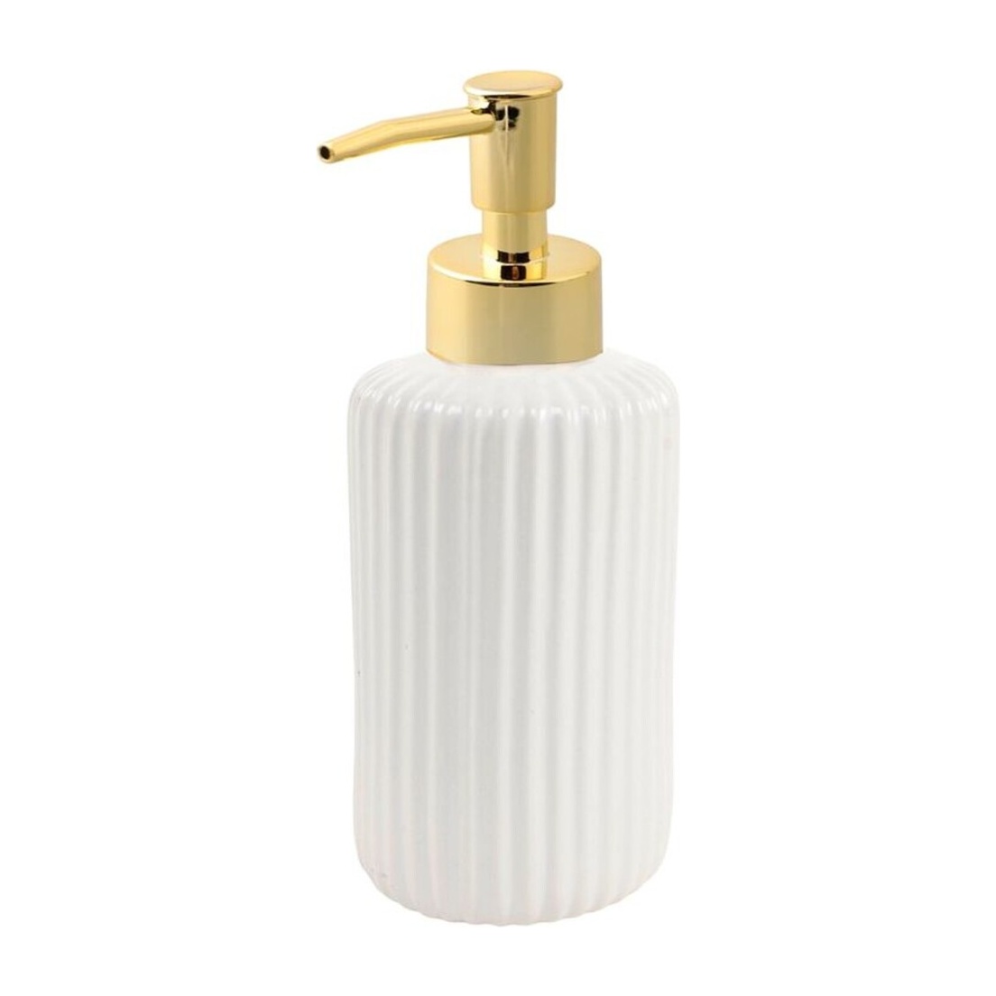 Distributeur de savon au design soigné, associant un corps cannelé blanc à une tête dorée brillante.