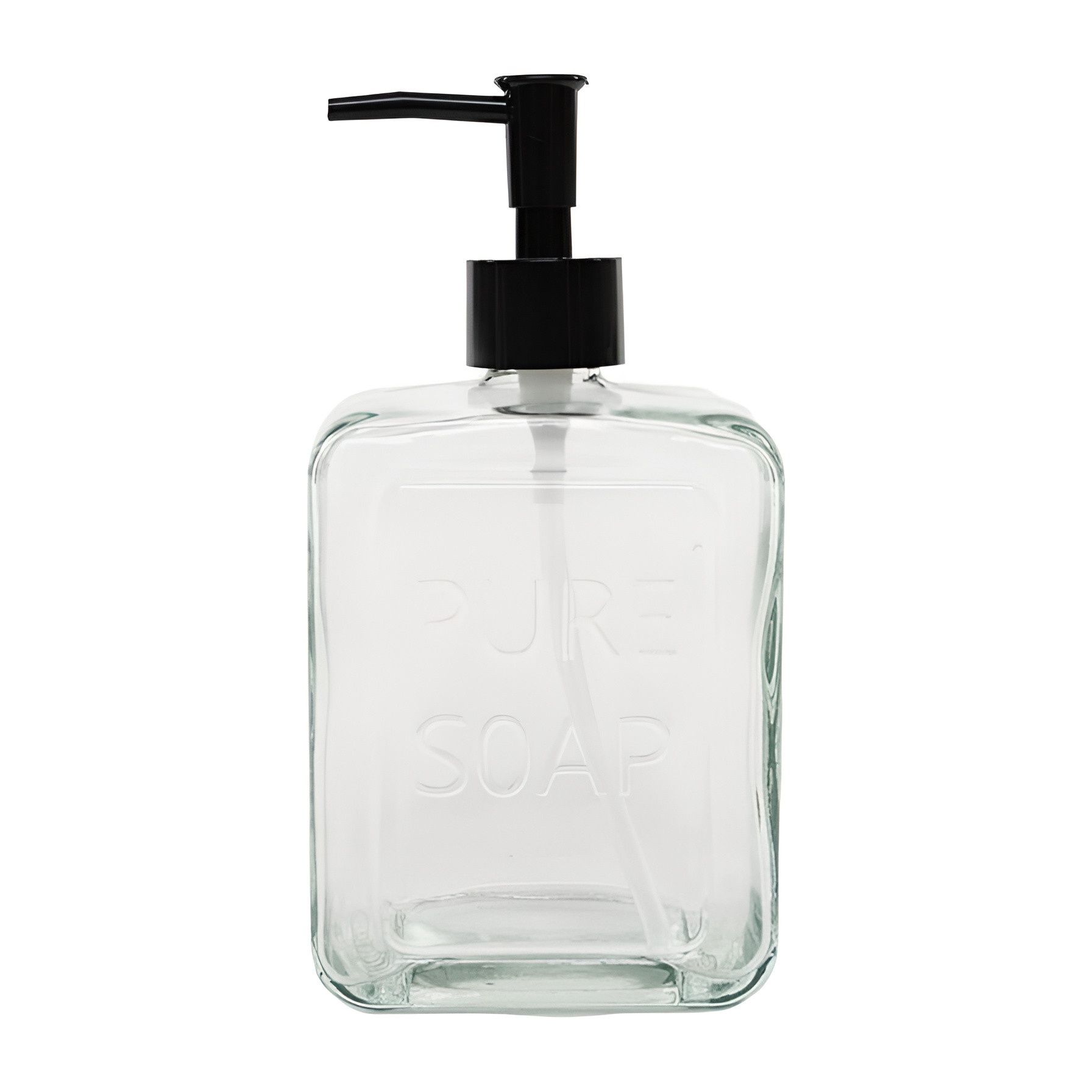 Élégant distributeur de savon embossé "PURE SOAP" qui apporte une touche décorative et intemporelle à la salle de bains.